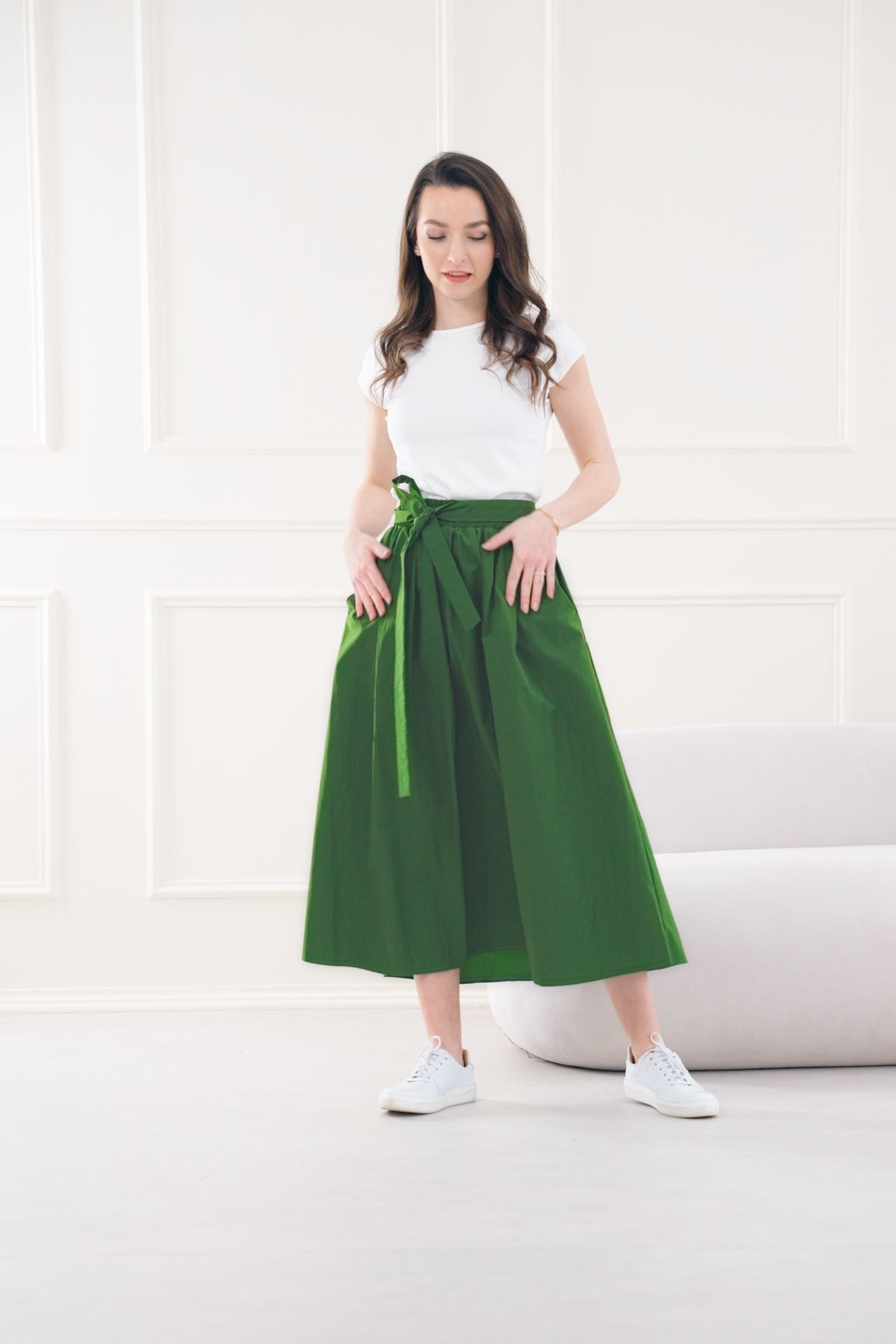 - Střih: Střižená je jako áčková midi sukně do gumy, která díky pružnému pasu perfektně sedí a nikde netlačí. Decentní řasení lichotí postavě a dodává sukni ženský objem.