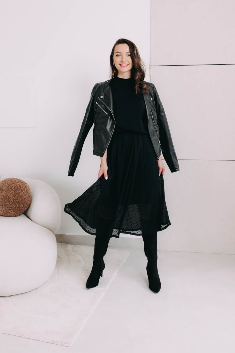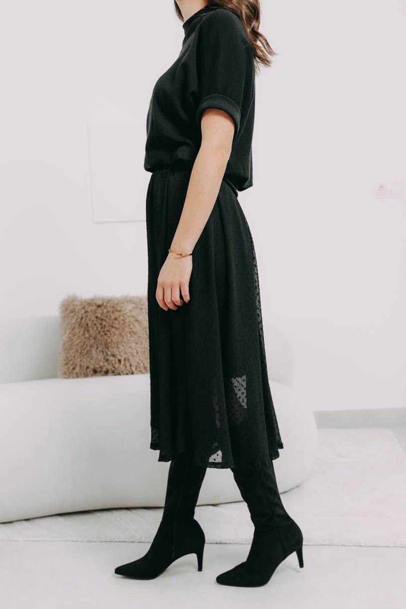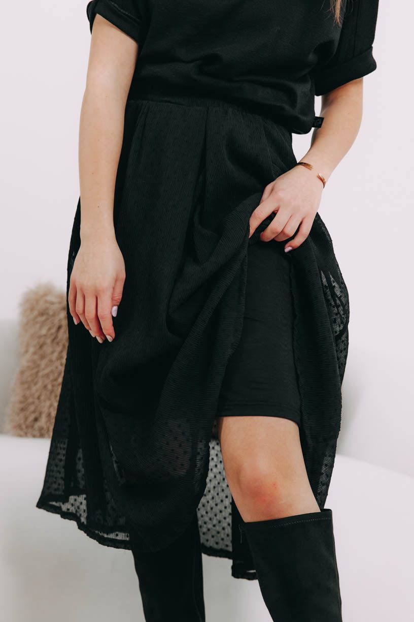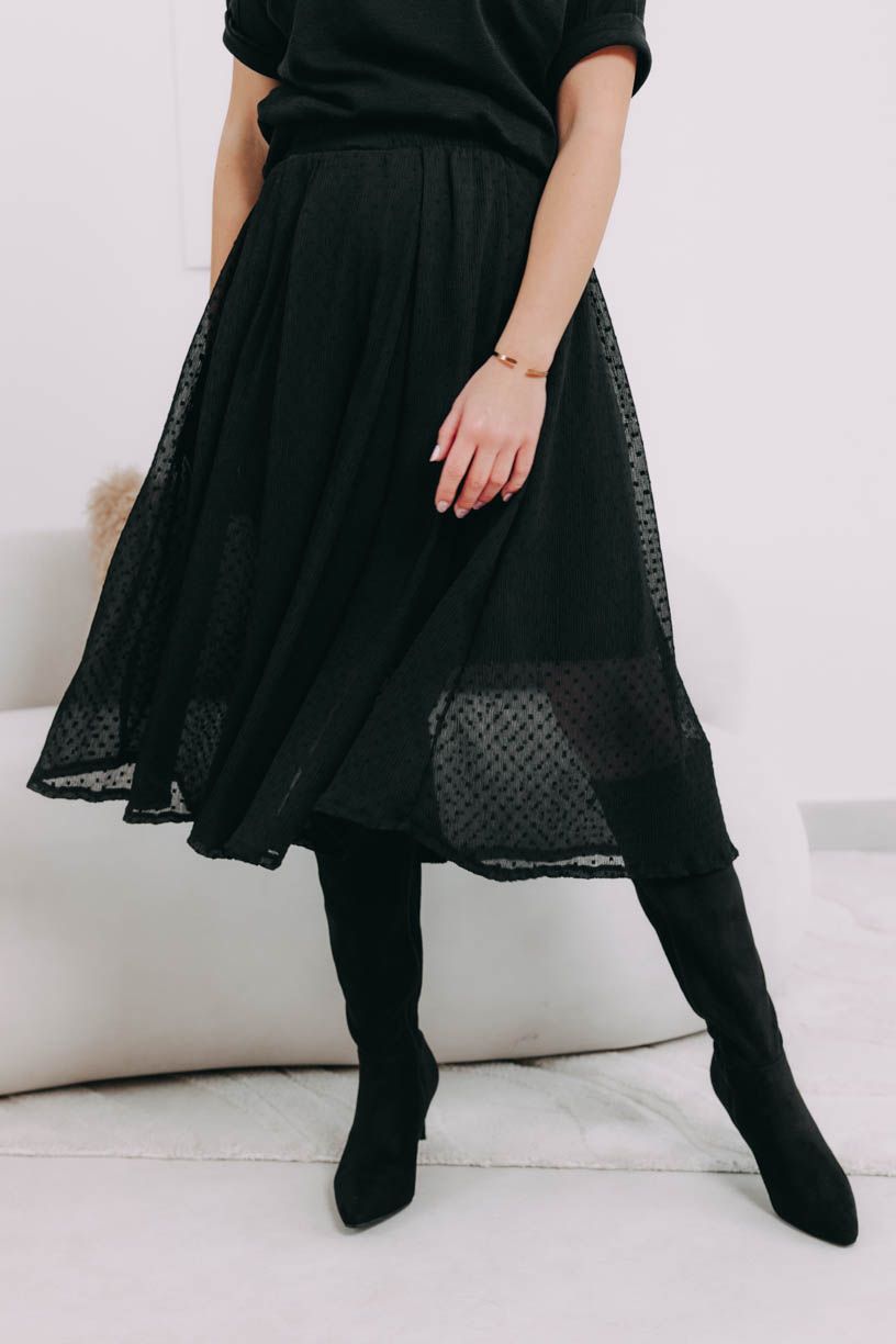 Černá midi sukně Zoraya je dokonalou volbou pro váš uhrančivý look. Tylová vrstva posetá puntíky dodá na hravosti i půvabu.