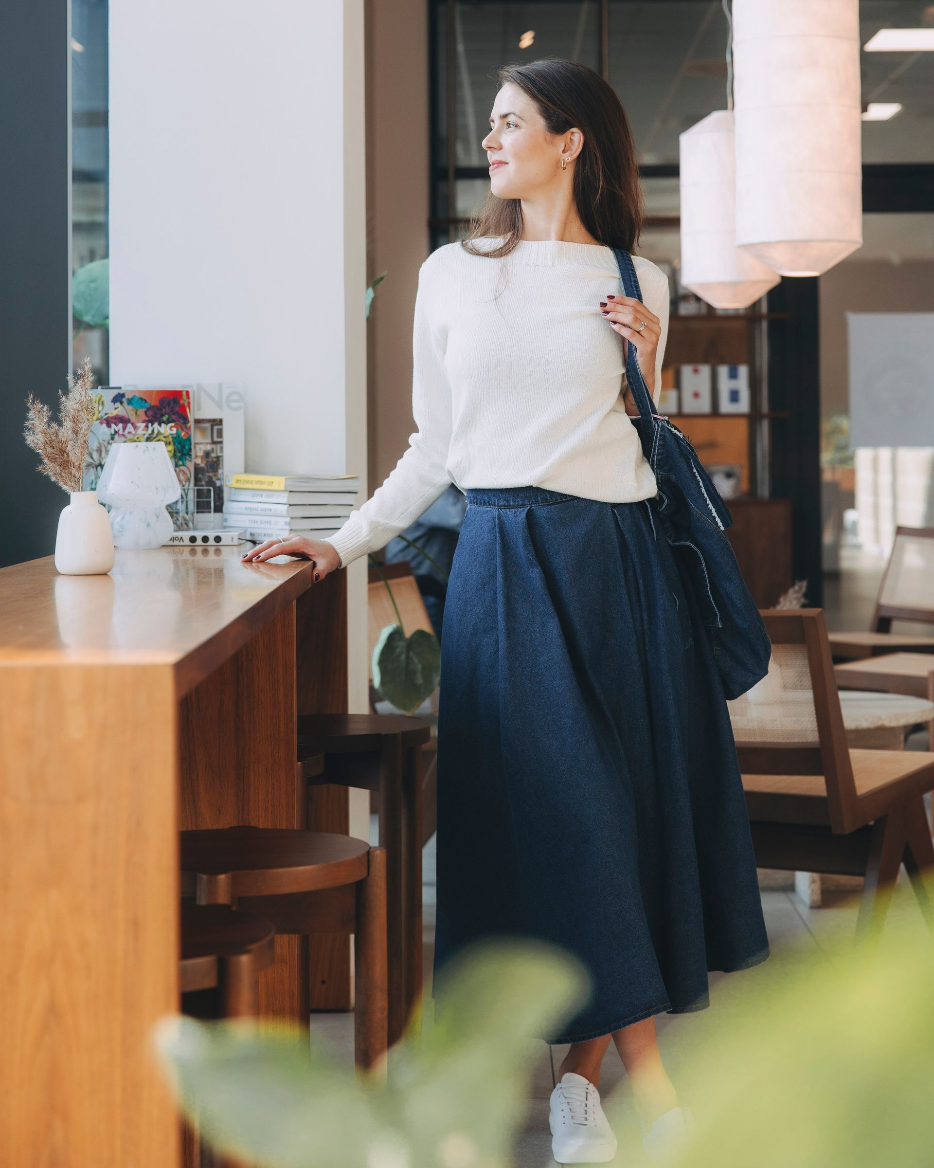 Luma je univerzálním svetrem pro váš osobní styl. Využijte jeho délku k bokům a elegantní lodičkový výstřih. Pro elegantní vzhled do práce ho oblékněte s bílou košilí se stojáčkem nebo ho zastrčte ho do kalhot s vysokým pasem. Na víkendové toulky městem ho zkombinujte s oblíbenými džíny a doplňte šátkem, který oživí lodičkový výstřih. Toto je svetr, který si nežádá pozornost, ale s grácií si ji získává.