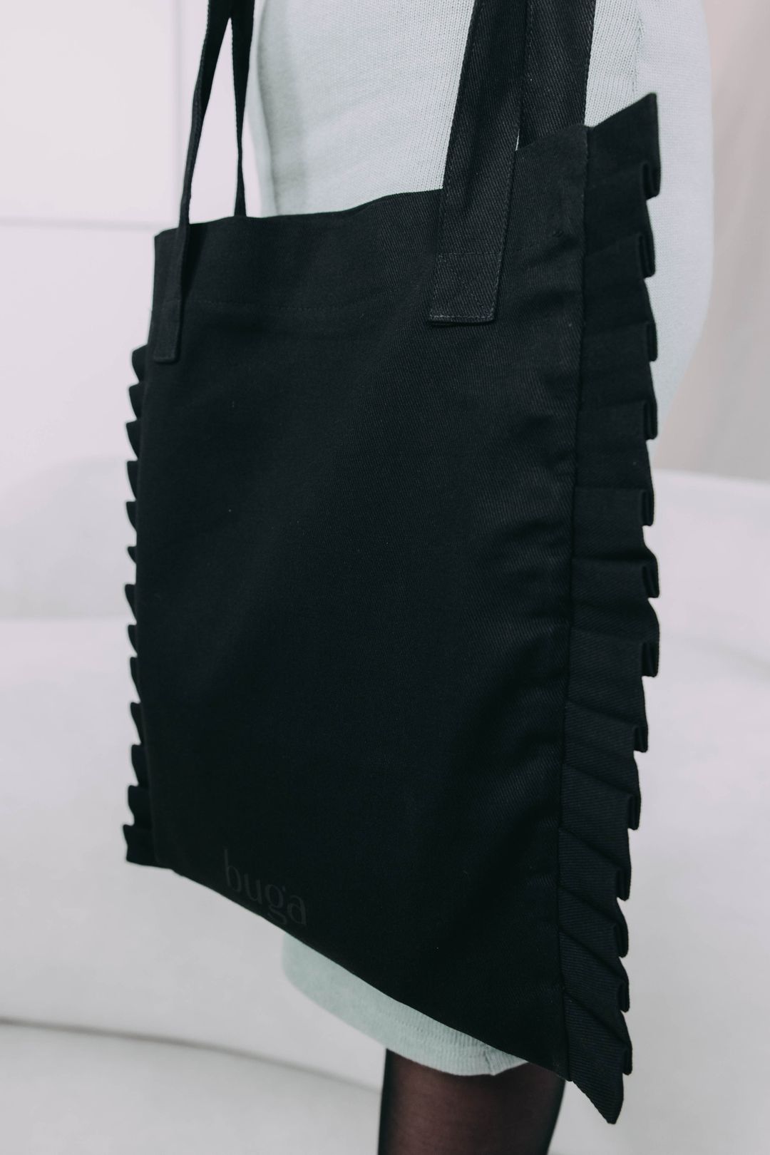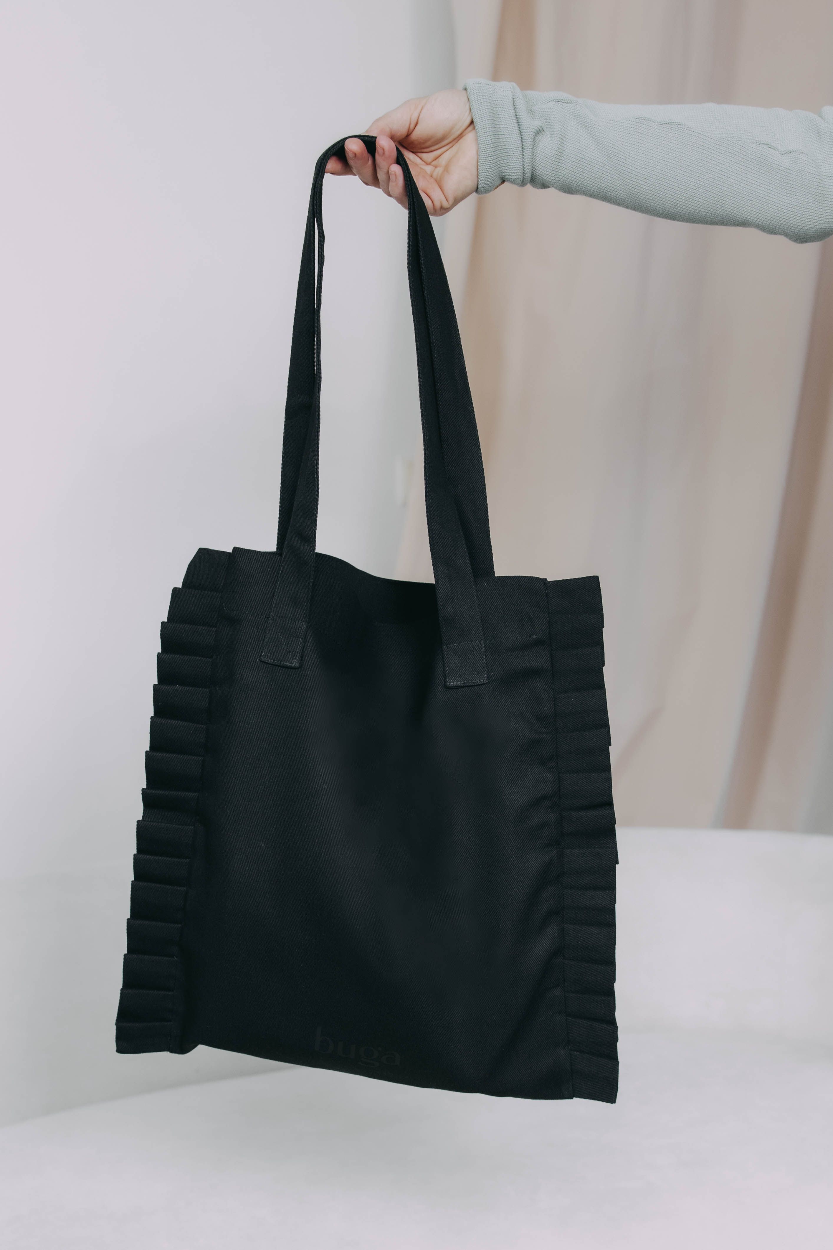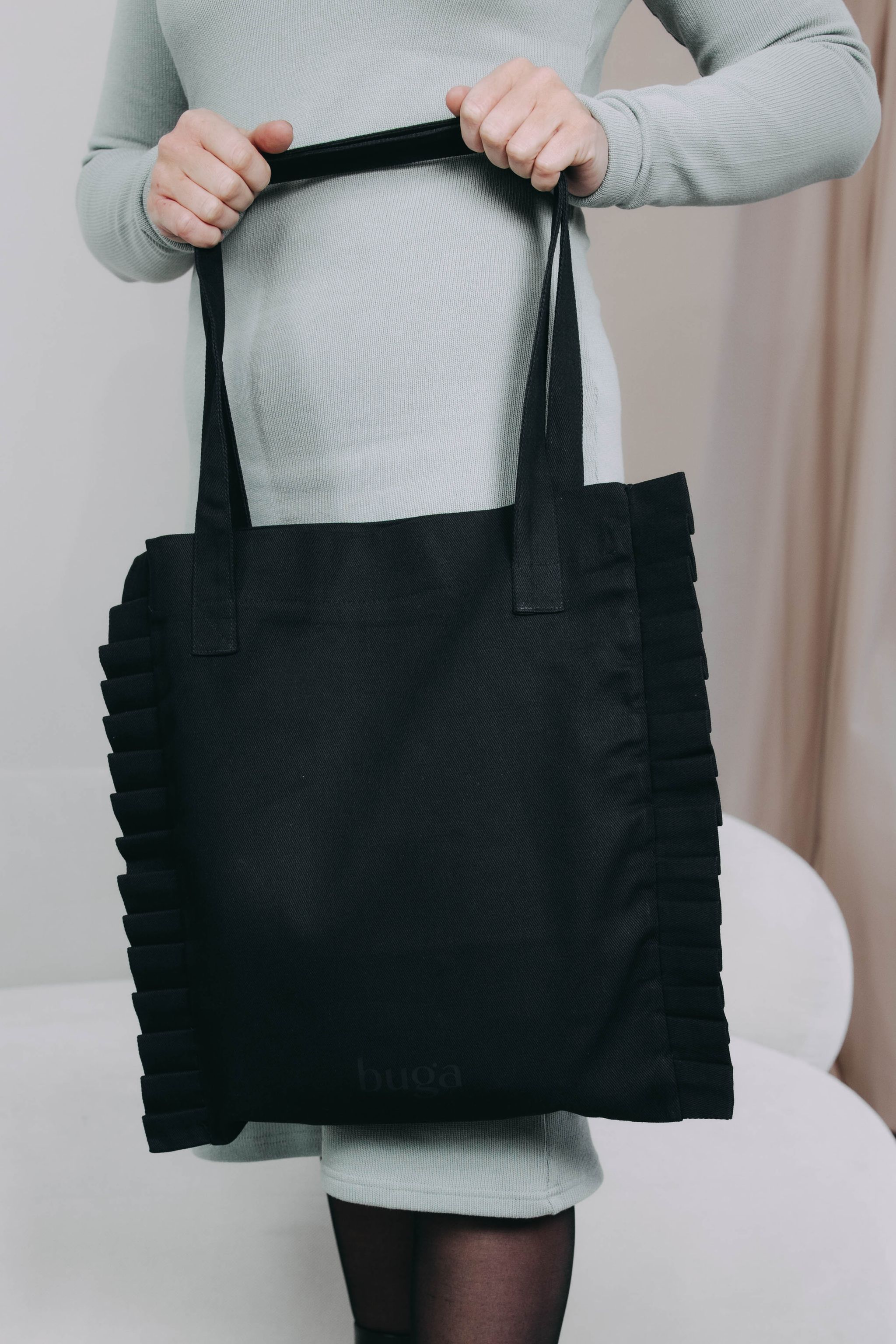 Fešnou tašku se hodí mít po ruce vždycky. Černá látkovka Amma z odolného plátna unese trénink i menší nákup. Navíc to řekne za vás nápaditými volánky.