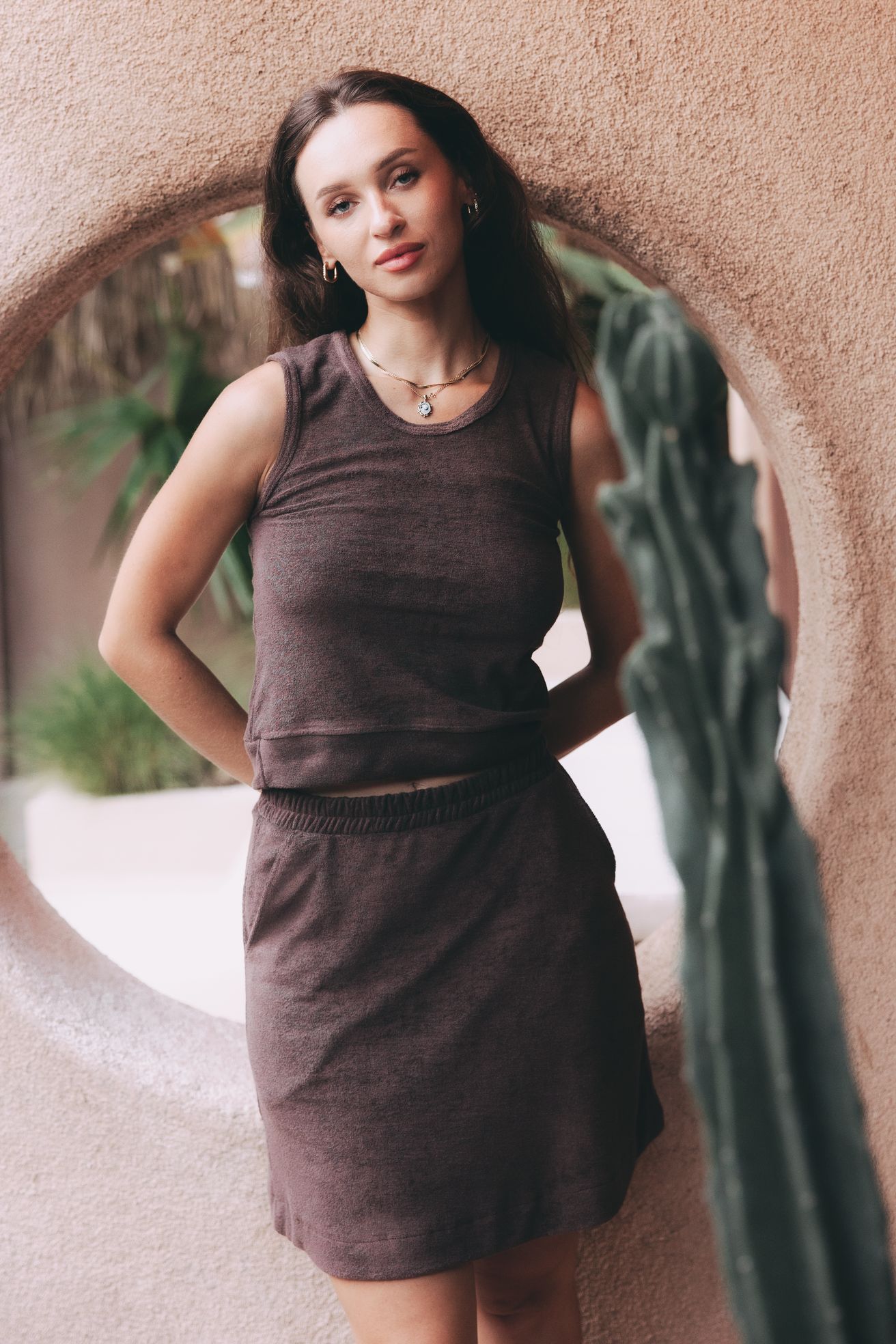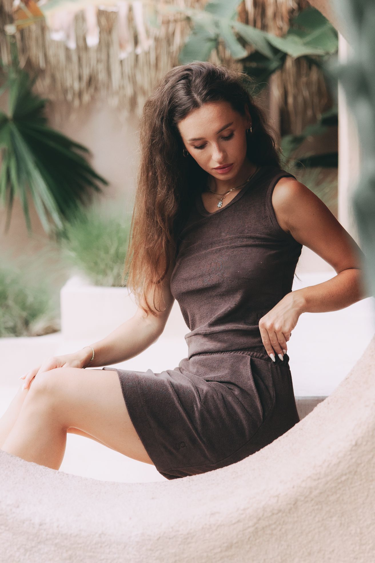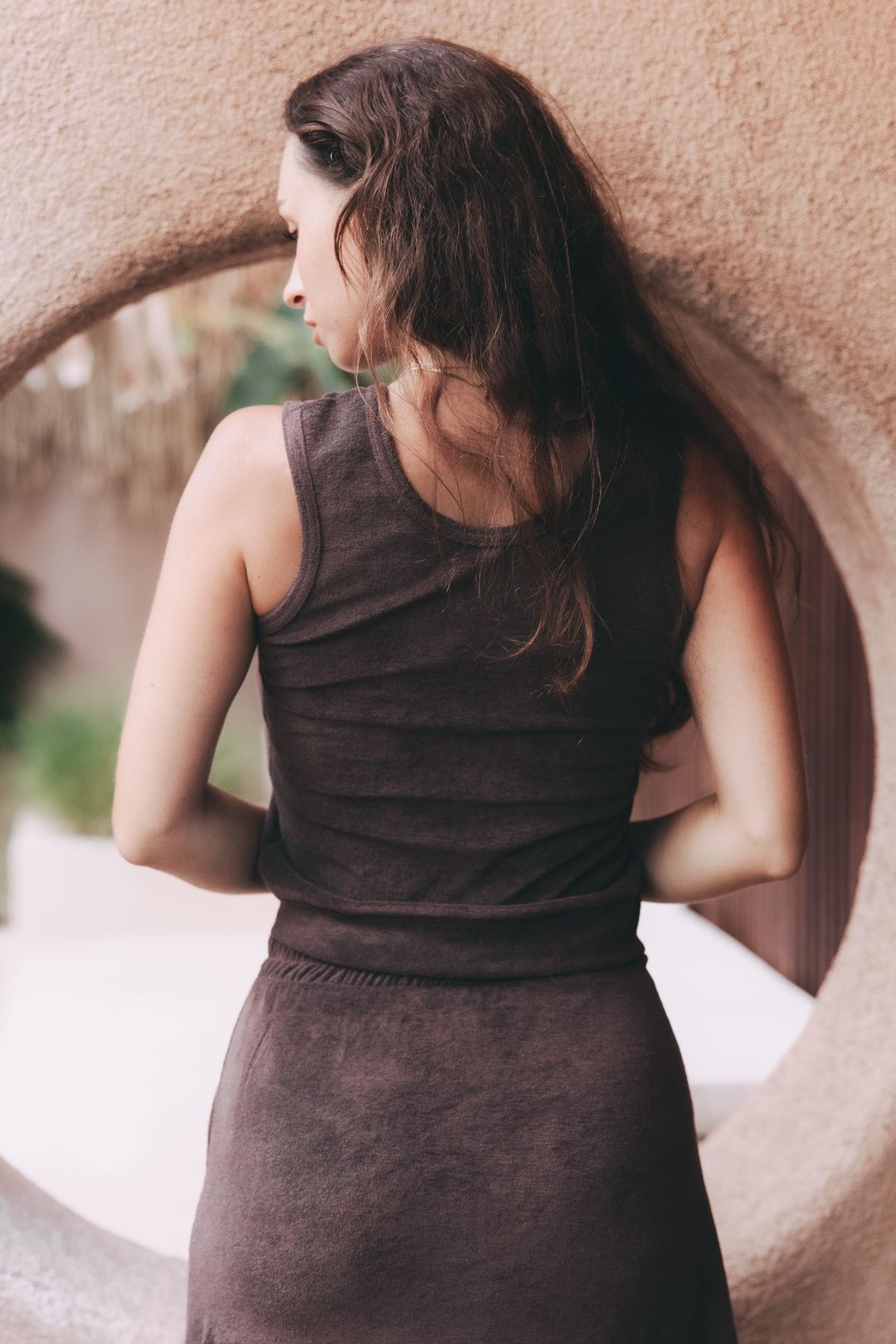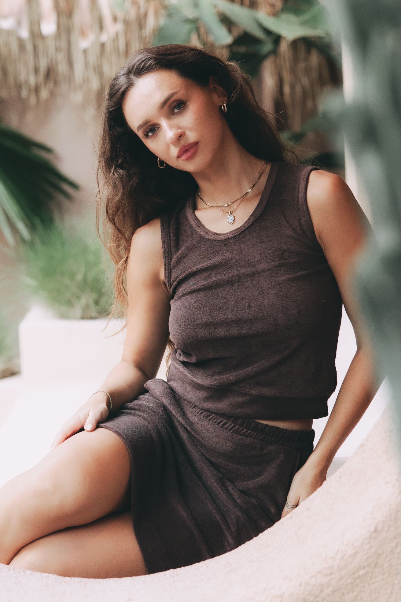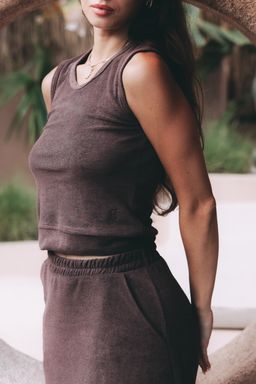 Klasický kulatý výstřih, optimálně přiléhavé průramky a spodní lemování, které crop top efektně zakončuje, dělají z Muru basic kousek podtržený neutrální a skvěle kombinovatelnou hněnou barvou.