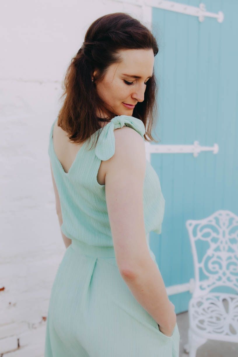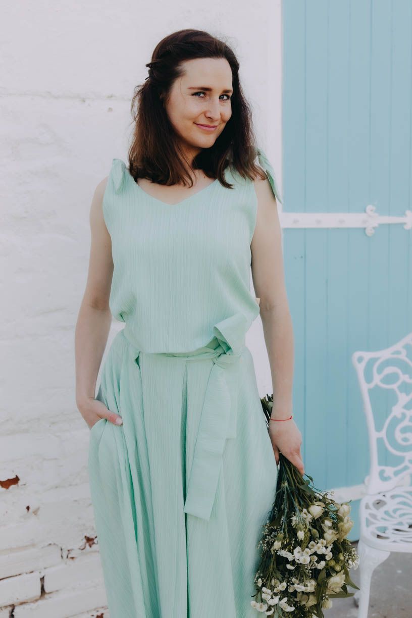 Lehce volný střih zaručí pohodlí a dodá sebevědomí i v případě, že je třeba zakrýt drobné nedostatky v oblasti bříška. (Koneckonců svatební obědy bývají vydatné, a není po nich snad nic pohodlnějšího, než volnější vršek.) Zavazování na ramenou vám dovolí i mírně variovat s jeho usazením, délkou i hloubkou výstřihu. Pokud se rozhodnete kombinovat top se sukní Mawe, pak právě mašličky na ramenou navíc krásně doplní její působivou mašli v pase.