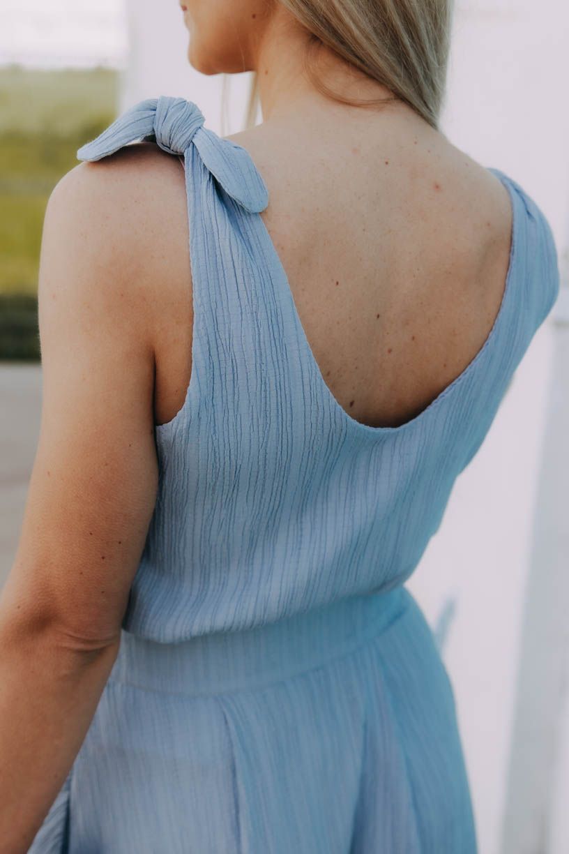 Lehce volný střih zaručí pohodlí a dodá sebevědomí i v případě, že je třeba zakrýt drobné nedostatky v oblasti bříška. (Koneckonců svatební obědy bývají vydatné, a není po nich snad nic pohodlnějšího, než volnější vršek.) Zavazování na ramenou vám dovolí i mírně variovat s jeho usazením, délkou i hloubkou výstřihu. Pokud se rozhodnete kombinovat top se sukní Mawe, pak právě mašličky na ramenou navíc krásně doplní její působivou mašli v pase.