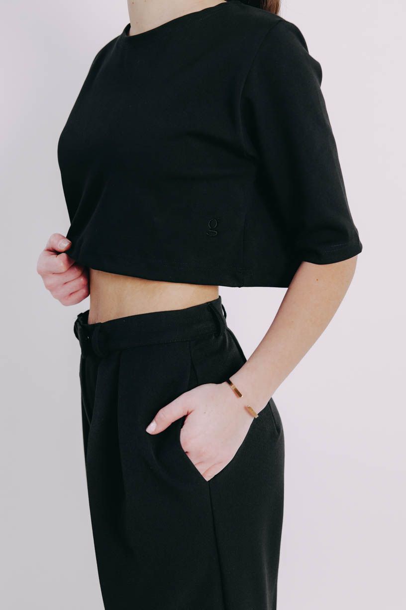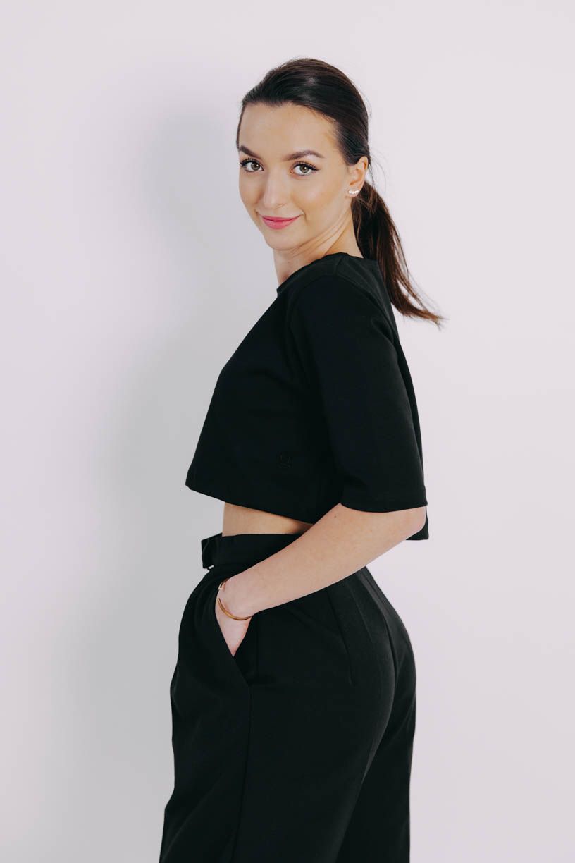 Bavlna s elastanem se postará o pohodlí a minimalistická černá barva zase o možnost kombinovat crop top se vším možným, co ve skříni zrovna najdete. A jestli můžem něco fakt doporučit, tak je to kombo se šaty Mandisa.