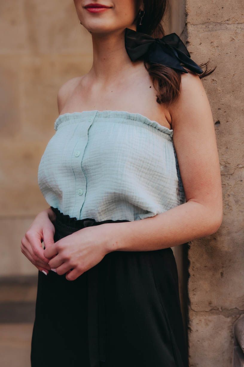 Top bez ramínek je na léto jedním z nejpříjemnějších kousků. Dia váš komfort ale vynese doslova do výšin. Díky příjemnému a všemi milovanému mušelínu se budete po celý horký den cítit – no doslova jako v bavlnce.
