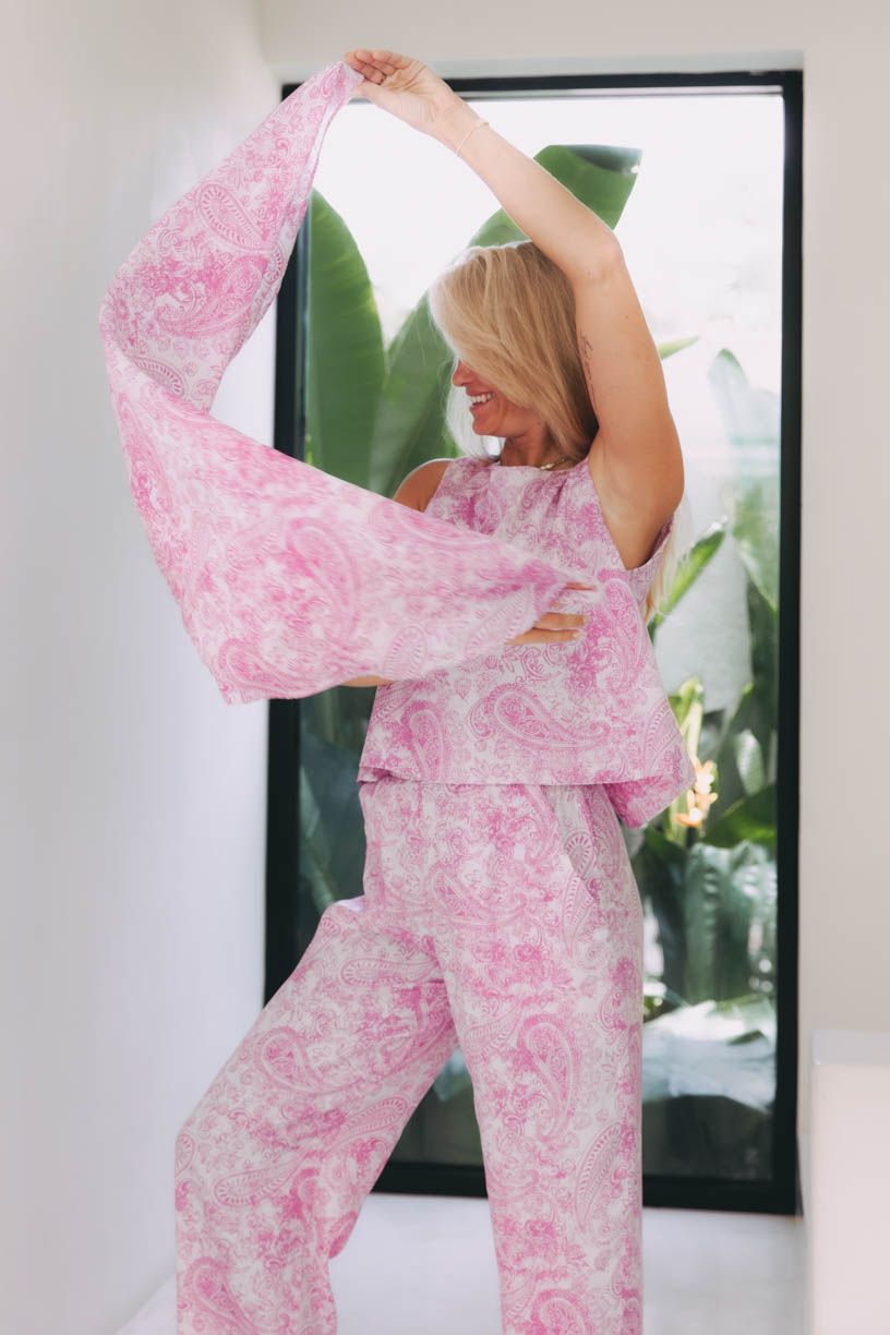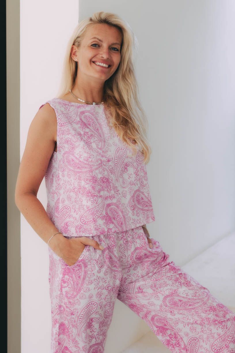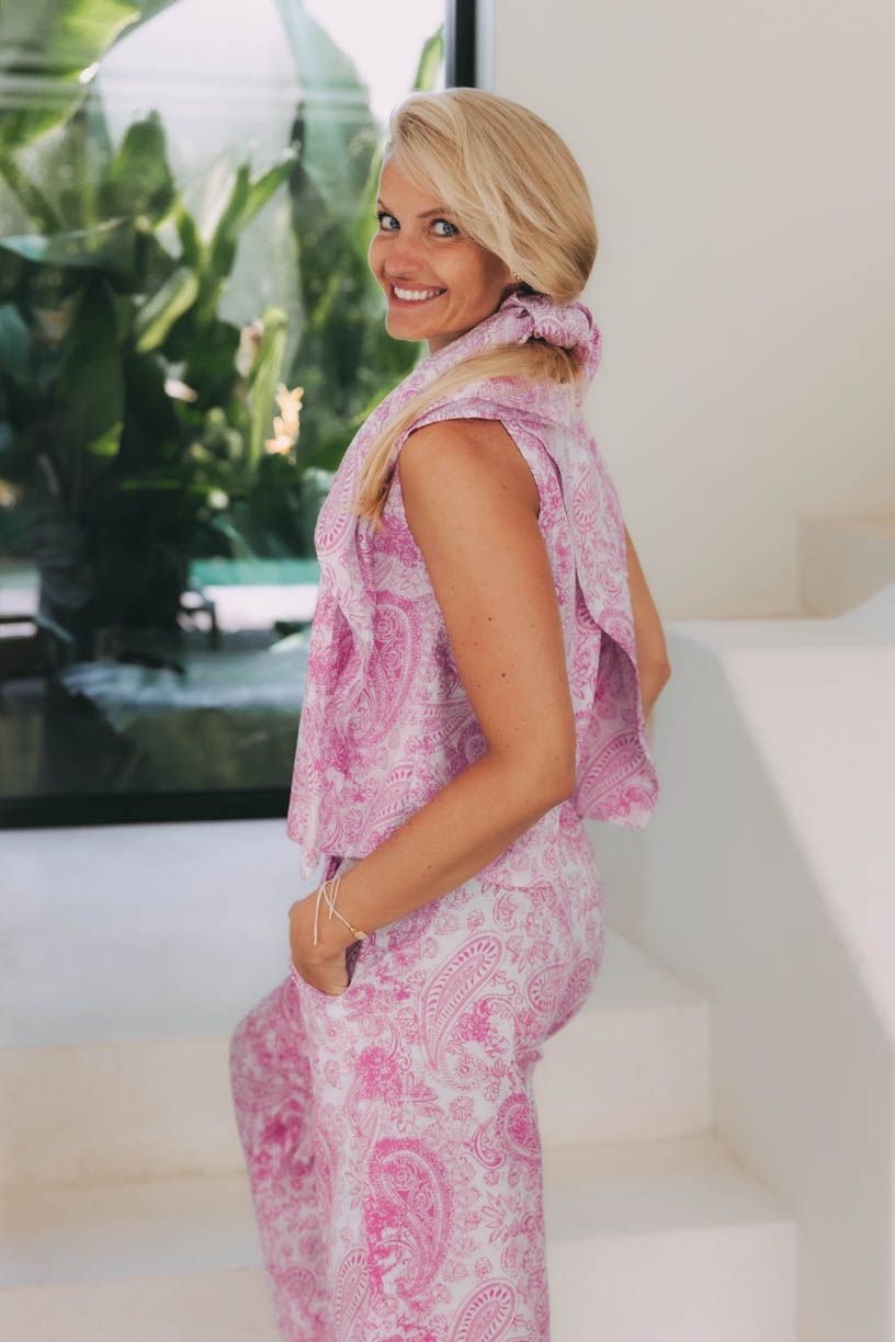 Není to totiž kousek jen na pláž nebo dovolenou – hravě a s grácií s vámi zvládne i pracovní nasazení v těch nejparnějších dnech. Chladivá viskóza vás bude příjemně hladit na holém těle, neobvyklý paisley vzor vás zase bude zdobit ve své nápadité, ale decentní a jemné růžovo-bílé kombinaci.