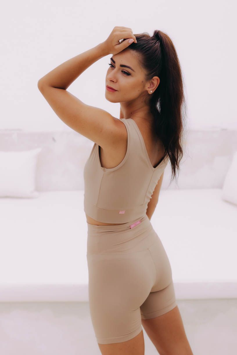Top Kali je pevný, pružný a odolný, takže ho nějaká kapička potu ani trochu nerozhodí. Má širší ramínka a spodní lem jsme opatřili příjemně širokým pásem, to všechno proto, aby hezky držel. Výstřih do V vpředu i vzadu pak dodá i takto sportovnímu kousku na eleganci.