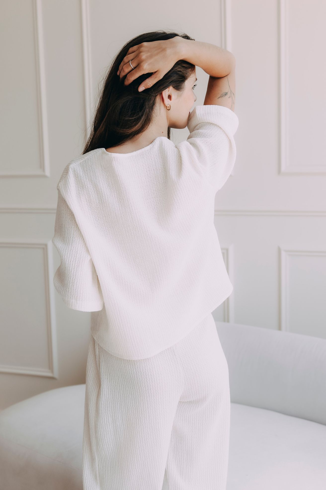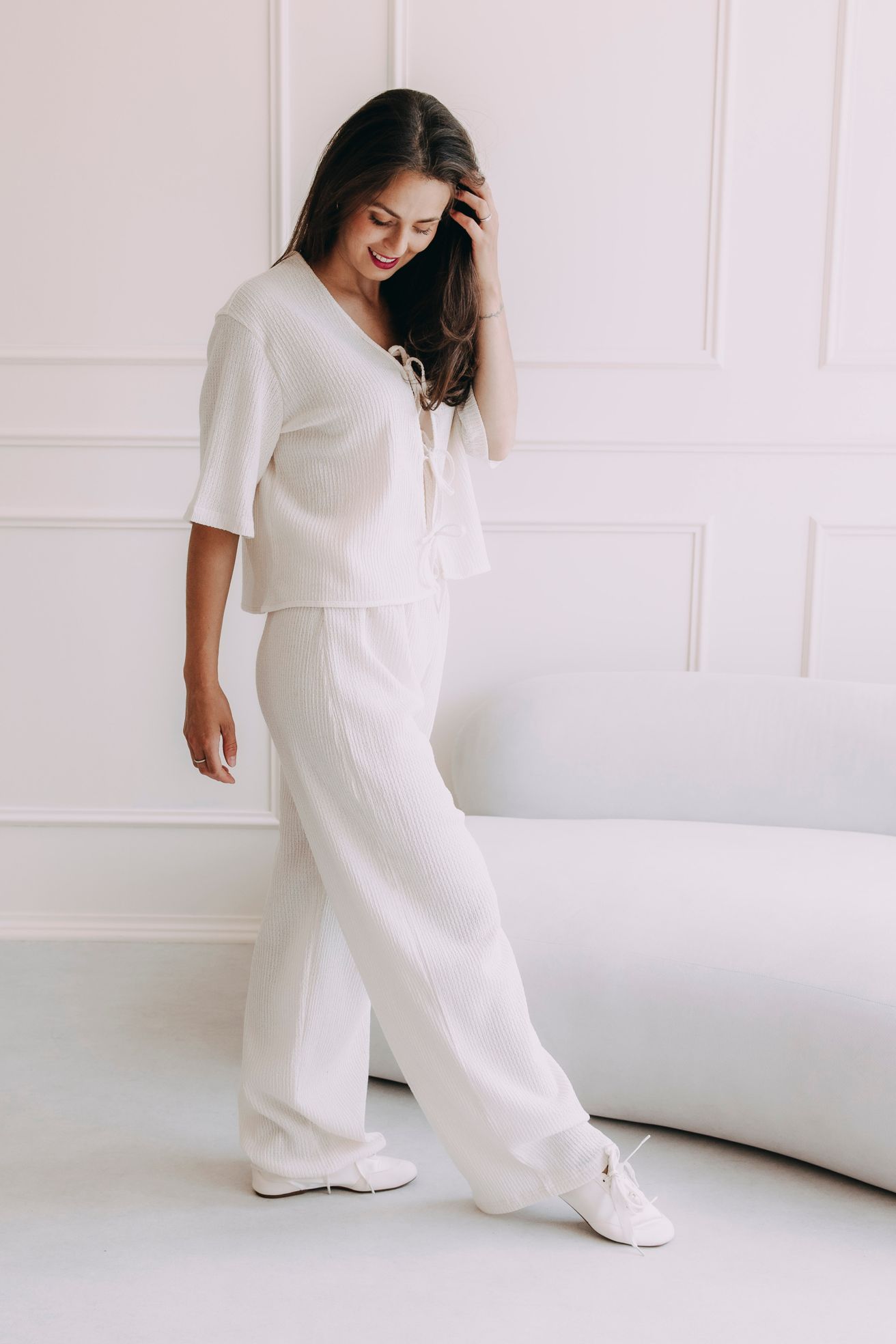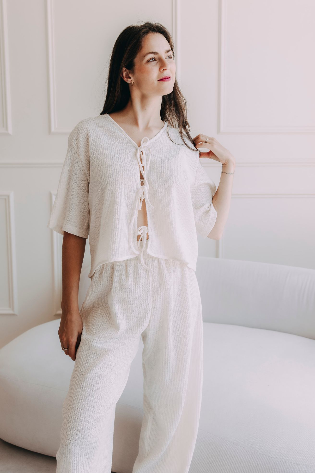 Top je ušitý ze stejné vroubkované látky jako kalhoty Kamau – a právě s nimi tvoří letní dvojku, kterou oceníte nejen na dovolené.
