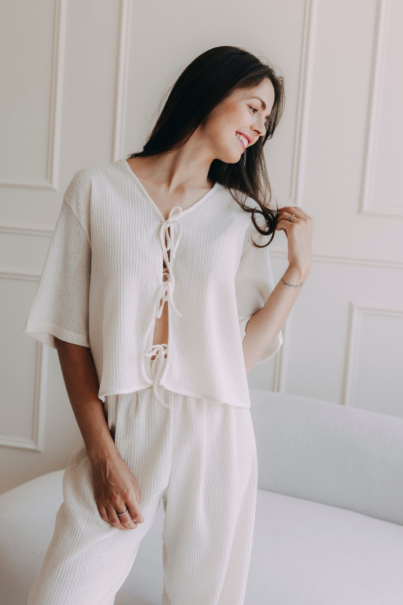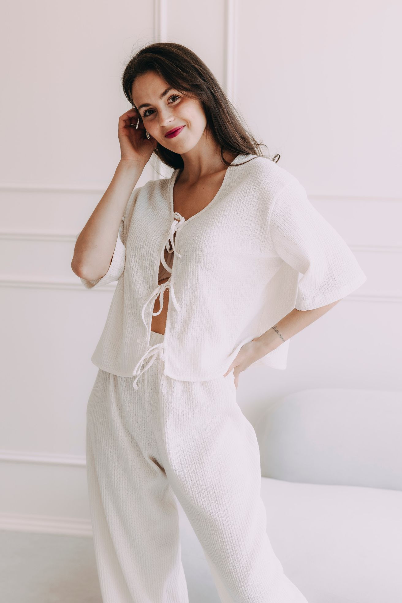 Top Kamau je jako letní vánek v parném dni: vzdušný, lehký, příjemně nespoutaný. Volný střih se širokými rukávy, které končí pod lokty, vám dopřeje komfort i v tom největším horku, zatímco elegantní vázání na tři mašličky na přední straně přidává na hravosti a ženskosti.