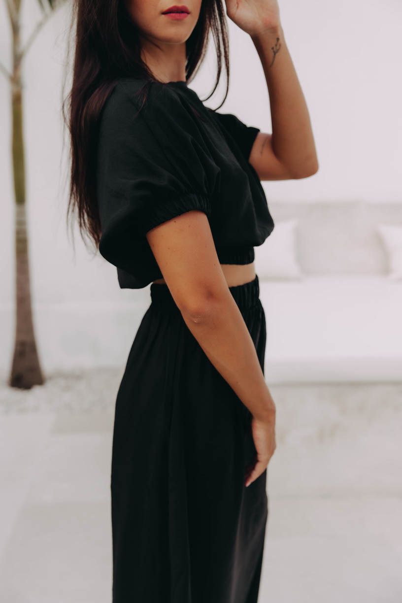 Širší kulatý výstřih dokonale doplňují volné balonové rukávky zakončené řasením a gumou, stejně jako spodní lem. Máte tak zcela ve své režii, jak mocný efekt podkasání vykouzlíte.