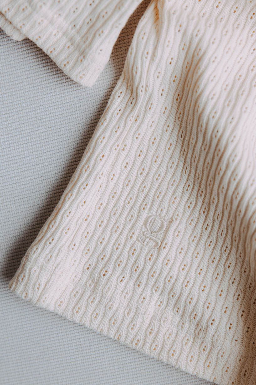 Velmi kvalitní materiál z organické bavlny je navzdory své vroubkované textuře lehký a jemný, trošku pruží a díky decentnímu dírkování i mírně prosvítá – ne ovšem tak, aby odhaloval, co nemá.