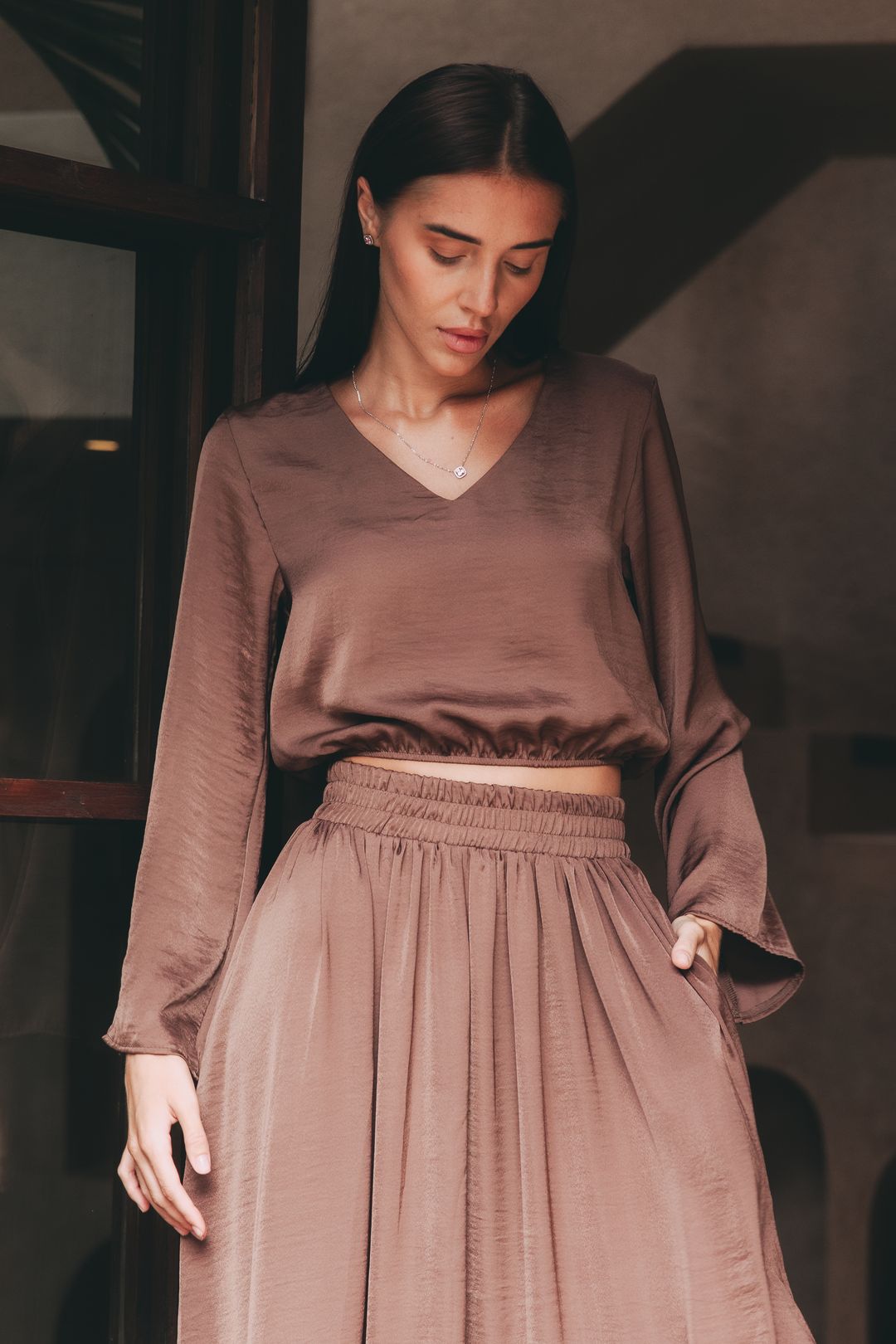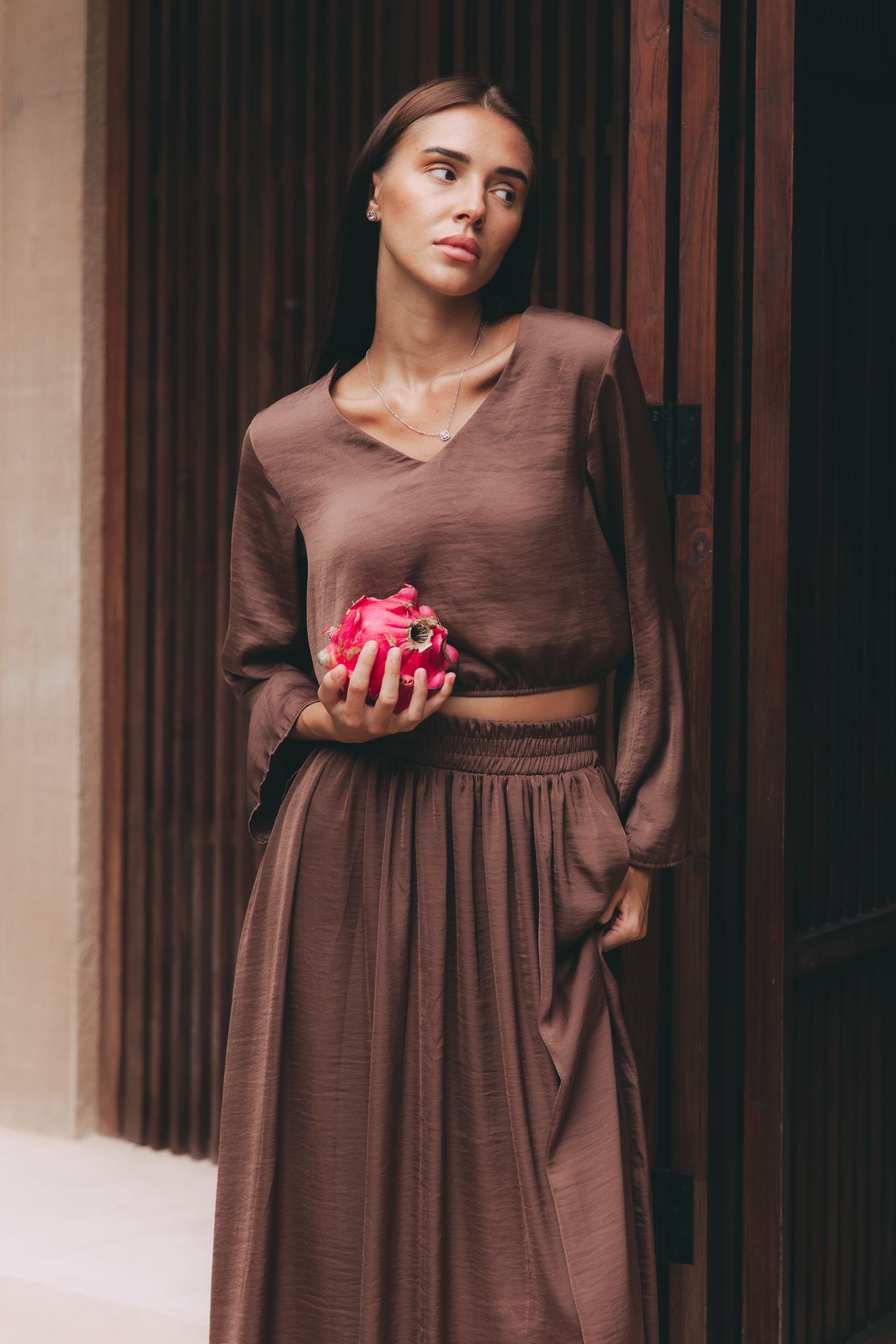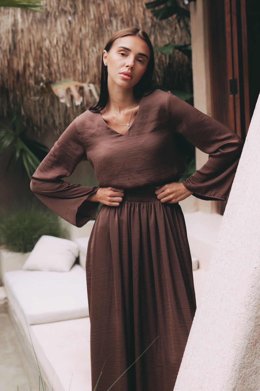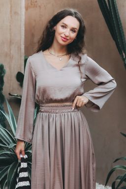 Tohle je top Reta. Kousek, u kterého jsme udělali výjimku a sáhli po polyesteru. Důvod je jednoduchý. Je neuvěřitelně lehoučký, dokonale prodyšný a ani po dlouhé cestě se nezmačká. Zatímco vpředu působí jemně, záda zdobí rafinovaný výstřih do „V“, který přirozeně přitáhne pohledy. Zvonové rukávy mu dodávají nespoutaný boho nádech a s každým vaším gestem vzdušně zatančí. Spolu se sukní Reta tvoří dokonalý pár pro toulky rozpáleným městem i večerní procházky po pláži.