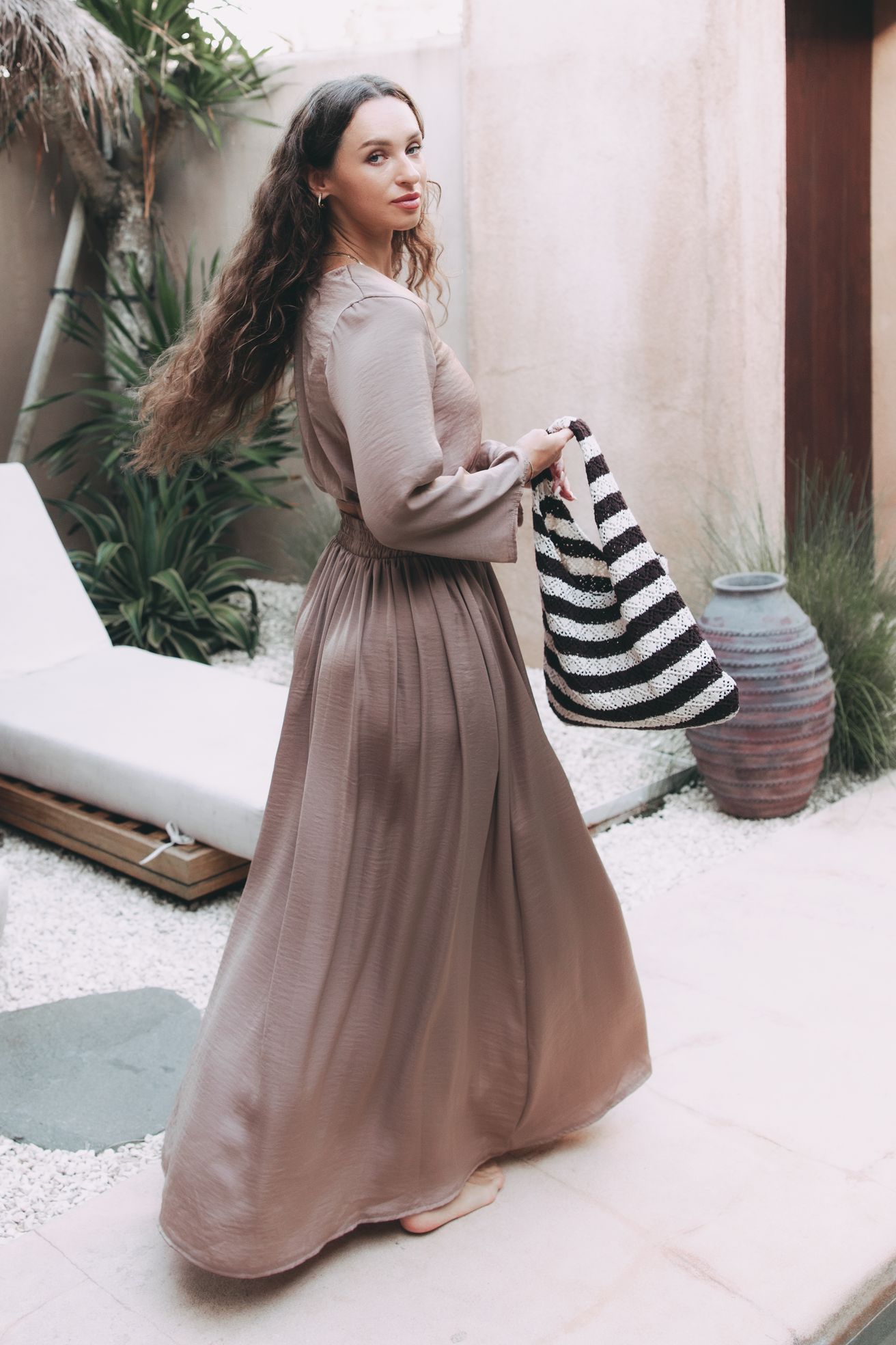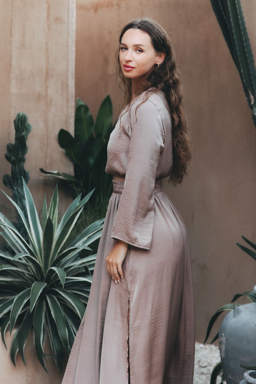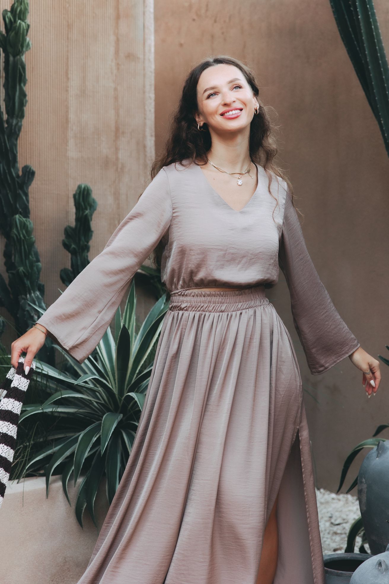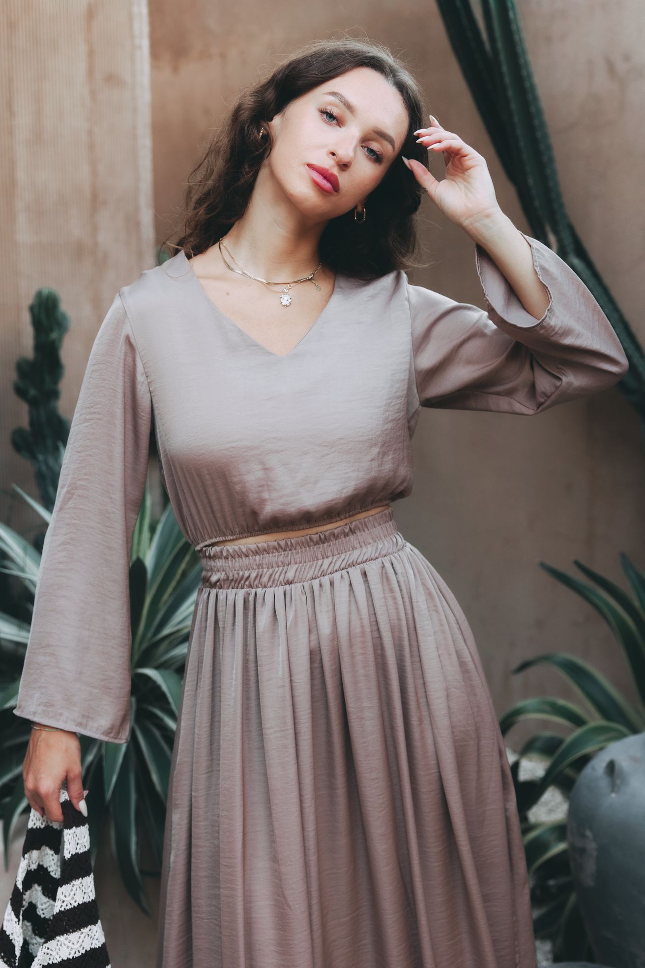Tohle je top Reta. Kousek, u kterého jsme udělali výjimku a sáhli po polyesteru. Důvod je jednoduchý. Je neuvěřitelně lehoučký, dokonale prodyšný a ani po dlouhé cestě se nezmačká. Zatímco vpředu působí jemně, záda zdobí rafinovaný výstřih do „V“, který přirozeně přitáhne pohledy. Zvonové rukávy mu dodávají nespoutaný boho nádech a s každým vaším gestem vzdušně zatančí. Spolu se sukní Reta tvoří dokonalý pár pro toulky rozpáleným městem i večerní procházky po pláži.
