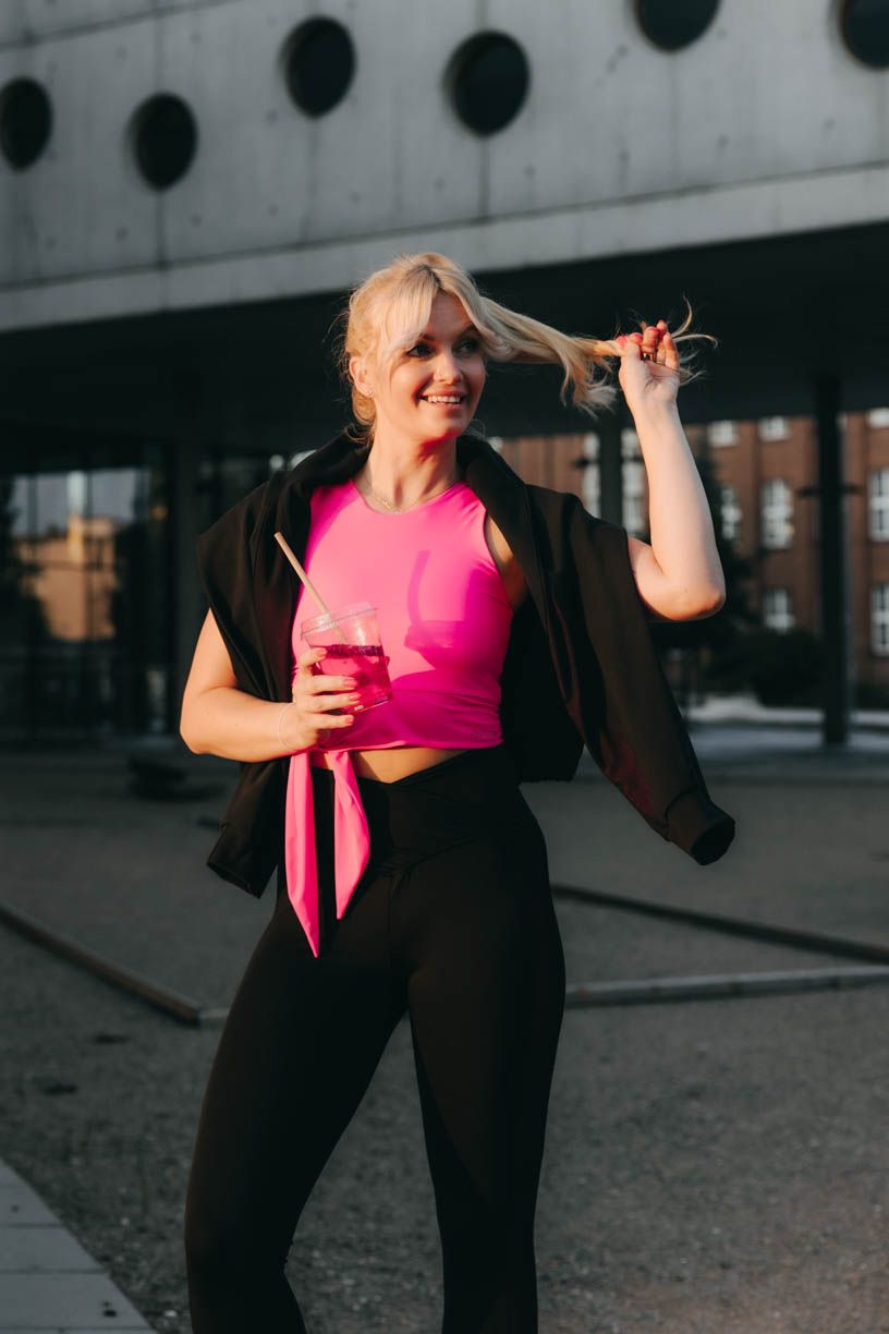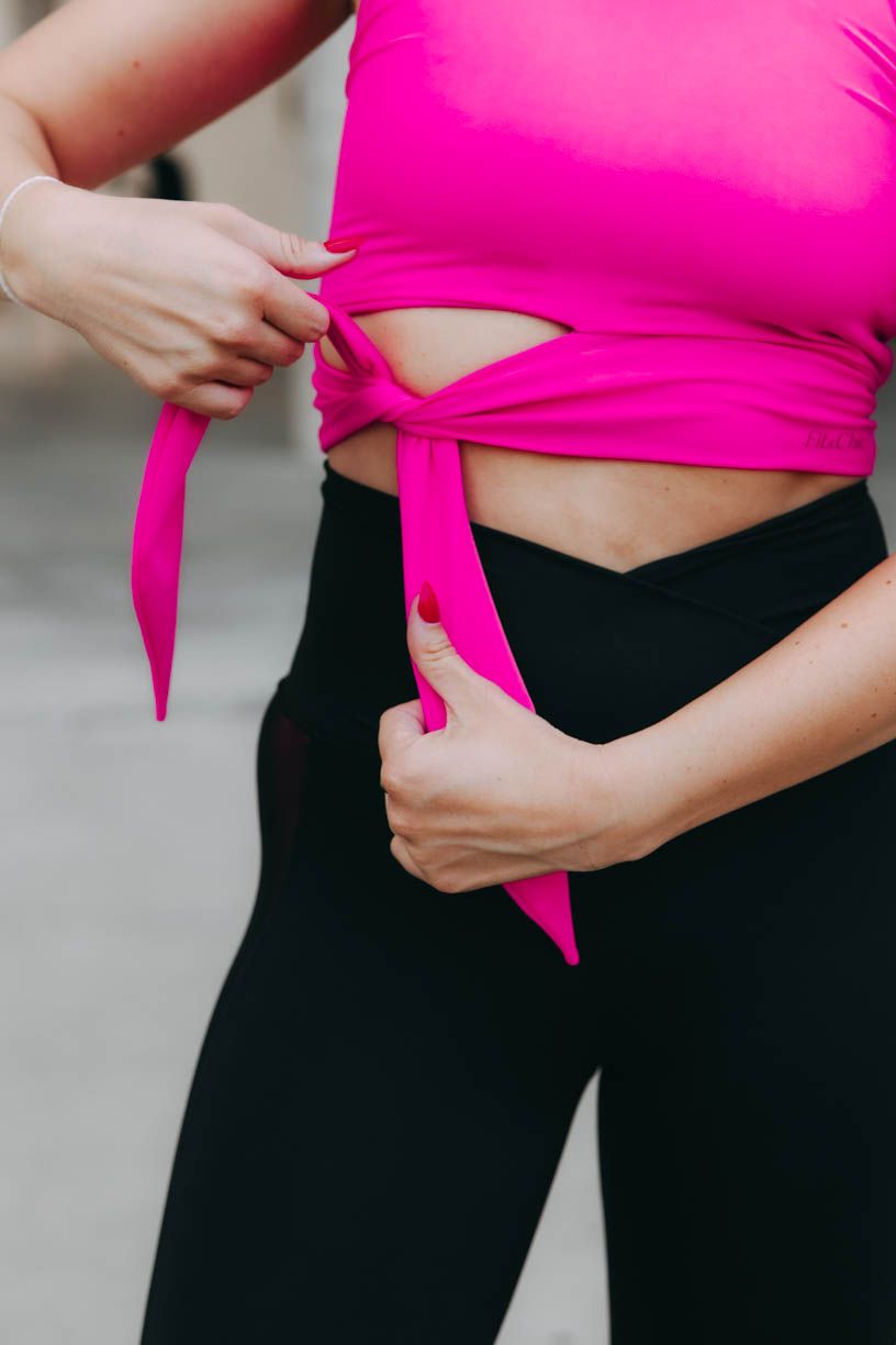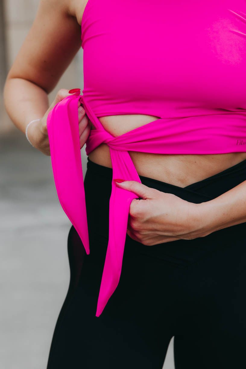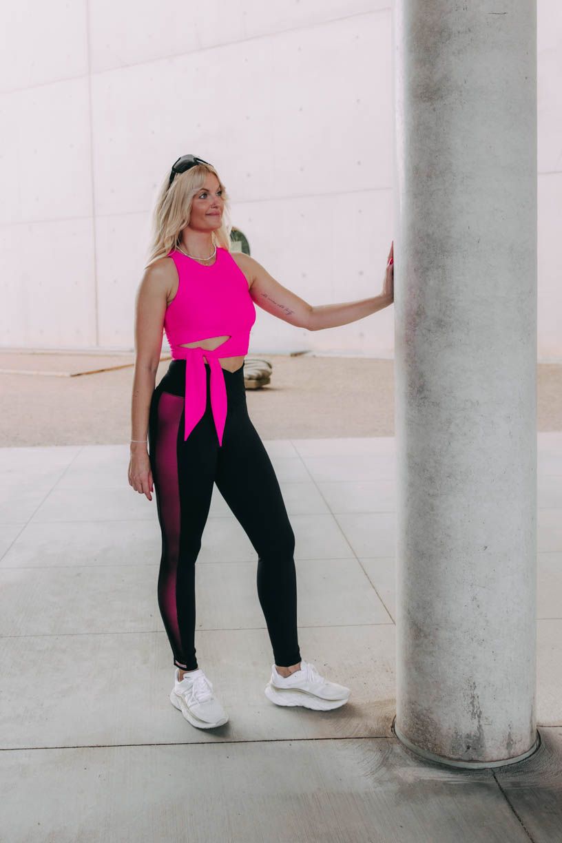 Trendy crop délku doplňuje nápaditý detail v podobě zavazování na mašli či uzel. Tato výrazná tečka z vás na tréninku udělá nepřehlédnutelnou sportovkyni. Aby toho nebylo málo, přidáváme i výraznou neonovou barvu. V tílku tak můžete po cvičení pohodlně vyrazit i na kávu.
