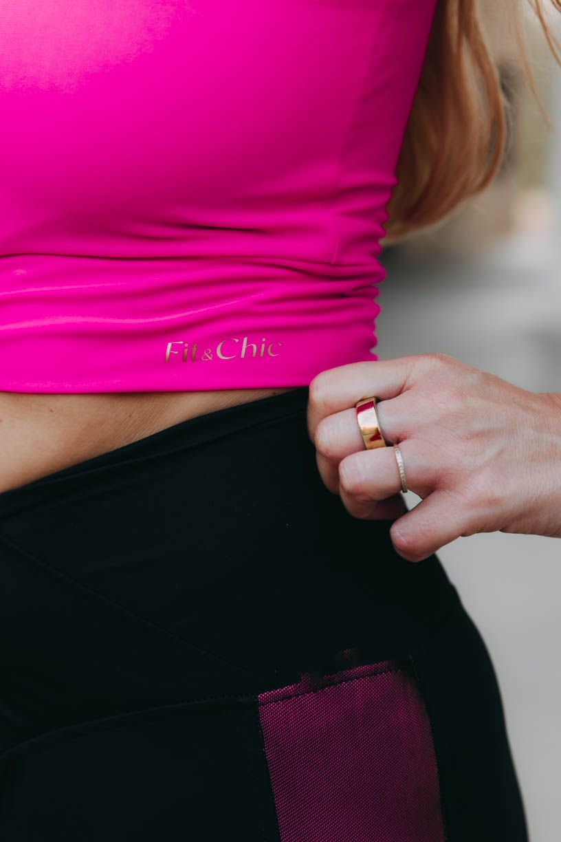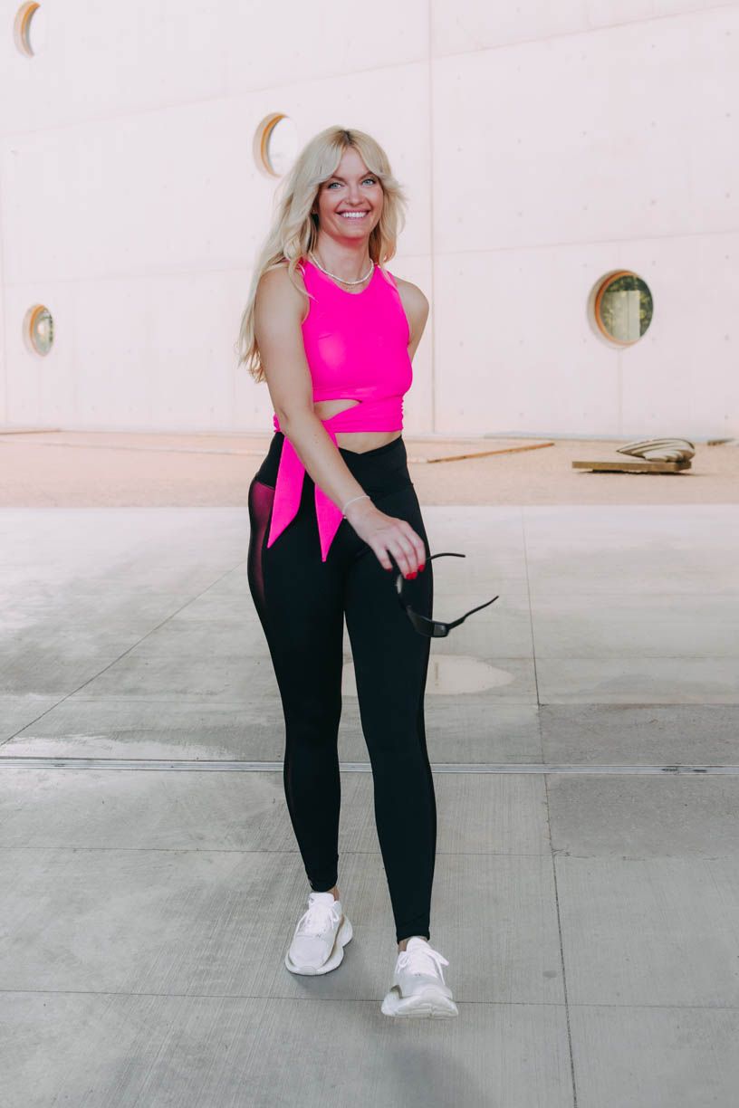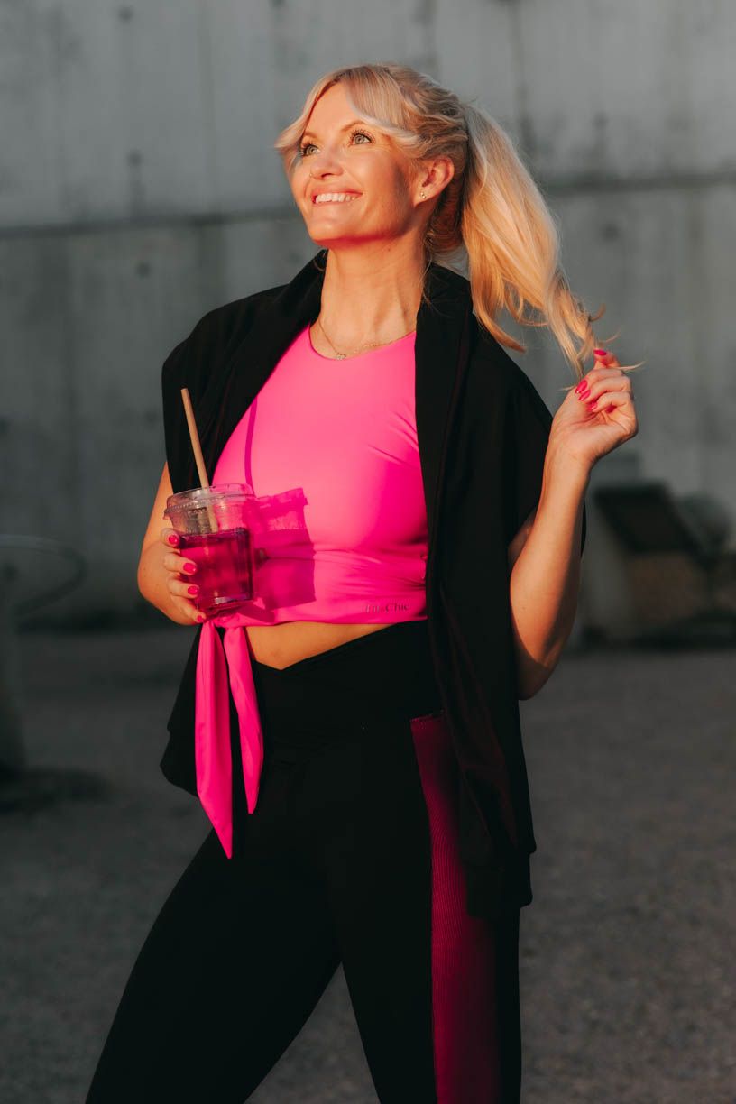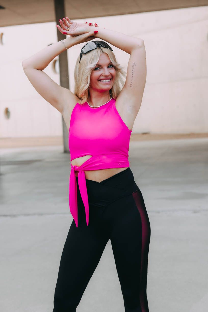 Trendy crop délku doplňuje nápaditý detail v podobě zavazování na mašli či uzel. Tato výrazná tečka z vás na tréninku udělá nepřehlédnutelnou sportovkyni. Aby toho nebylo málo, přidáváme i výraznou neonovou barvu. V tílku tak můžete po cvičení pohodlně vyrazit i na kávu.