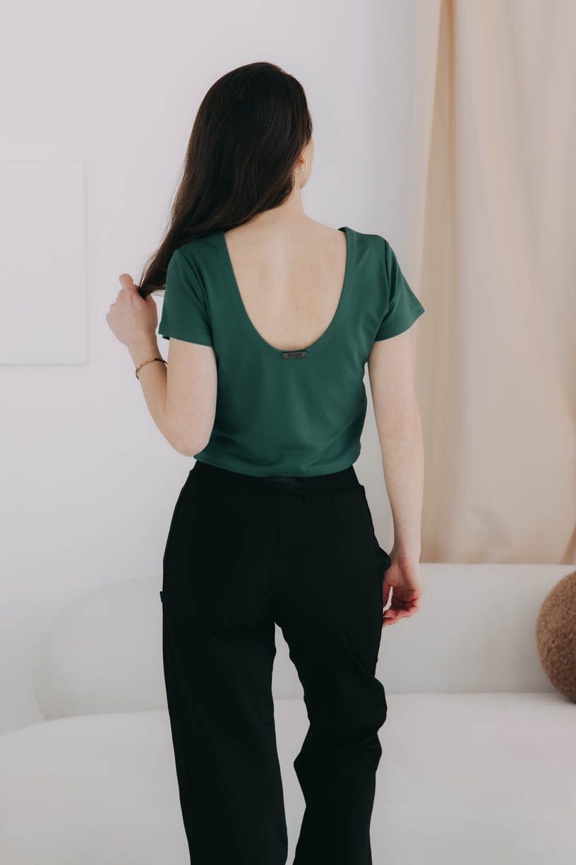 Top Aina s lodičkovým výstřihem jsme ušili z příjemné viskózy, takže si hezky drží svůj tvar, i když ten den nebudete vědět, kam dřív skočit.