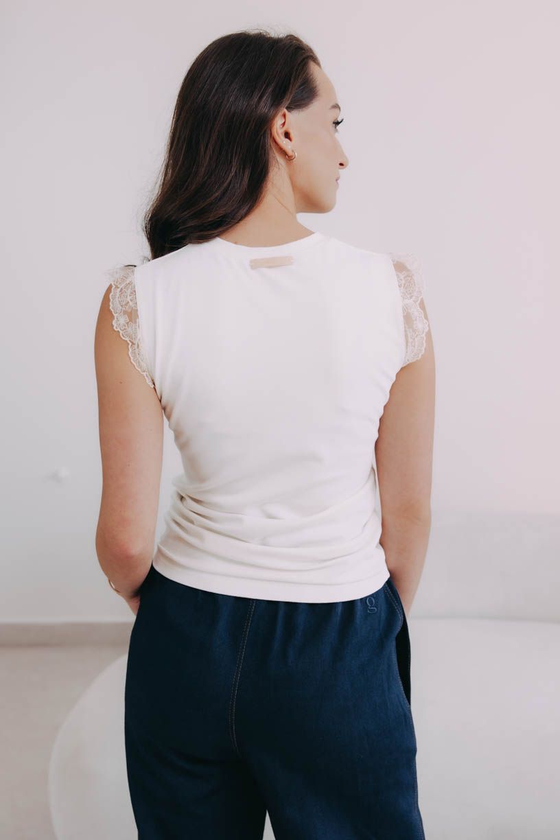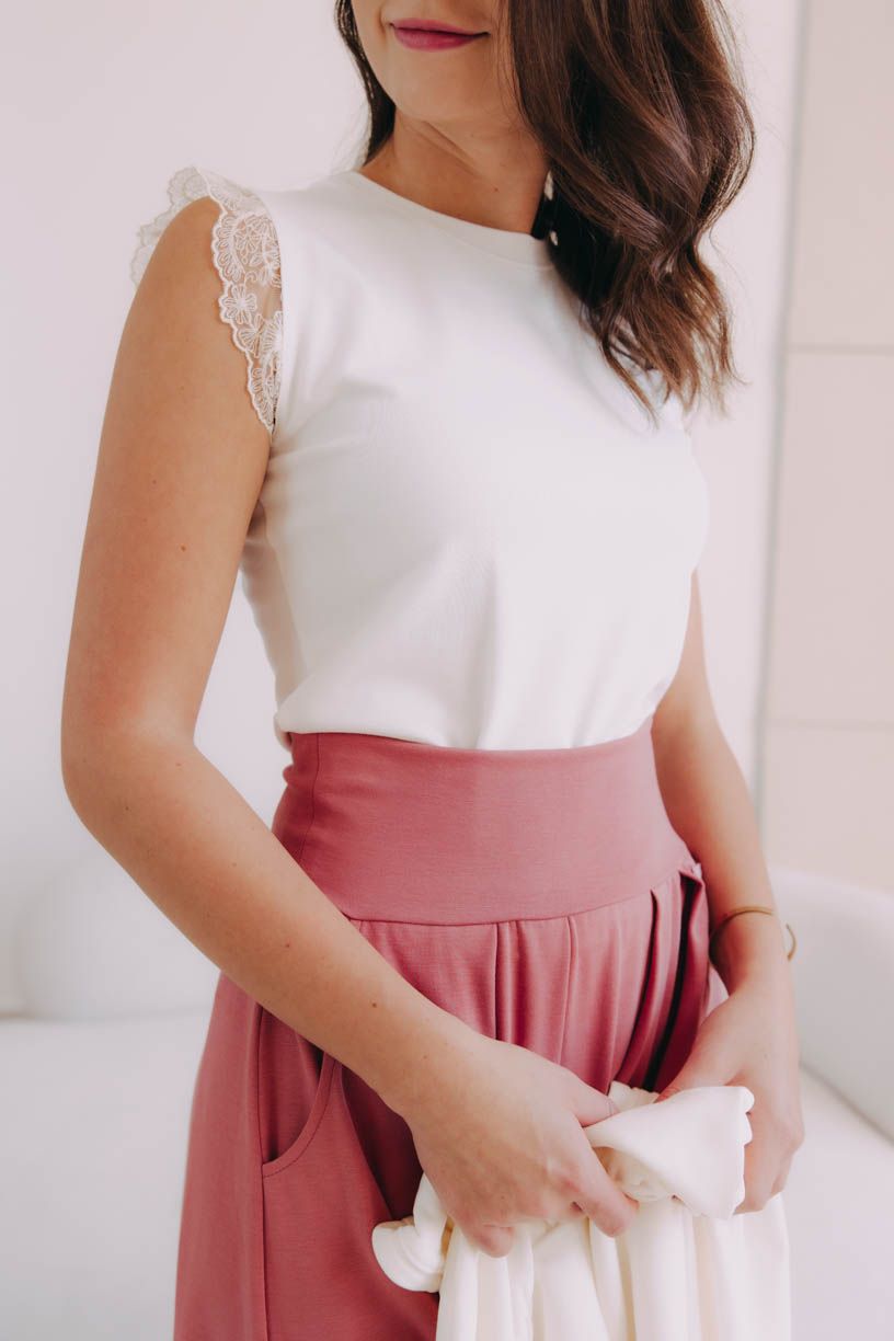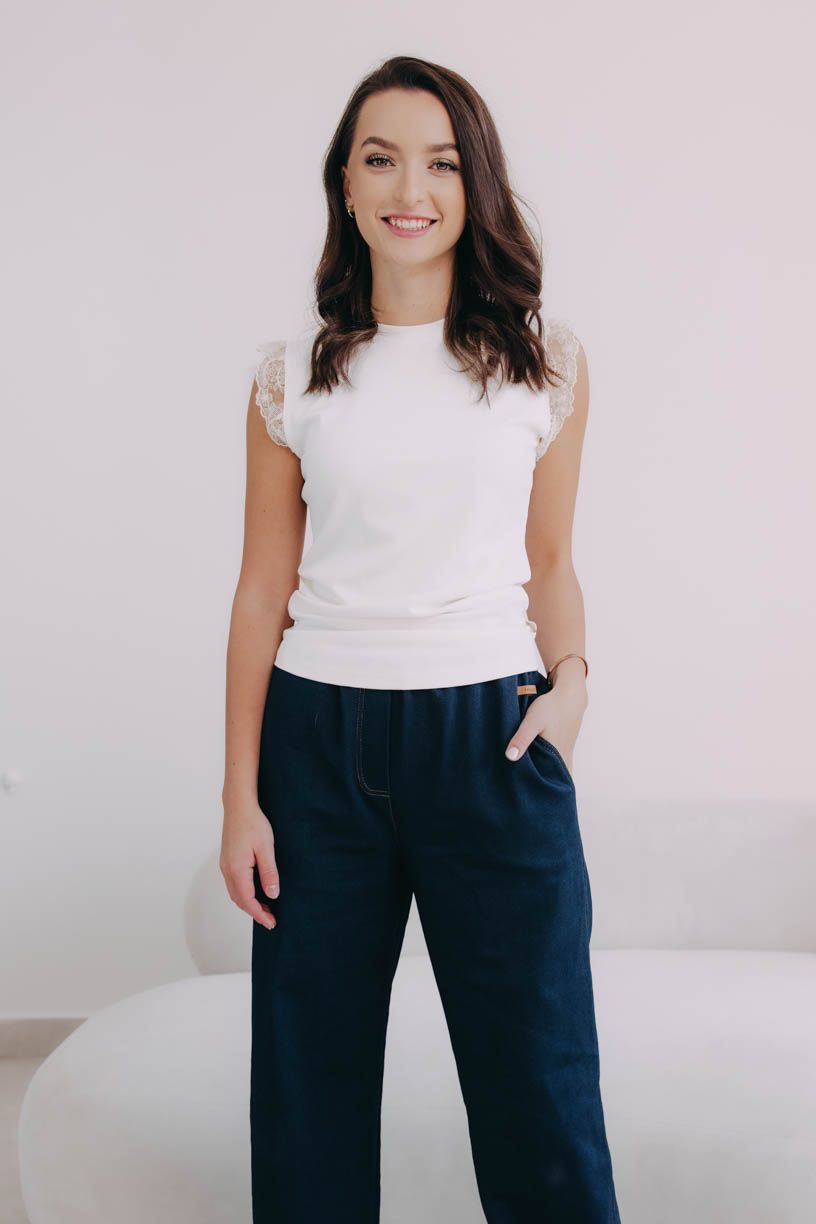 Top Akua svým střihem vychází z oblíbených z triček Kenda. Hezky obepne tělo, ale nemá hluboký výstřih na zádech. Co ho však definuje na první pohled, je efektní krajka na ustřižených rukávech. Něžný detail pěkně ladí s elegantnější pouzdrovou či áčkovou sukní, všemi typy kalhot, ale hodí se i do ležérnějších outfitů. Bílá vás navíc krásně rozzáří.