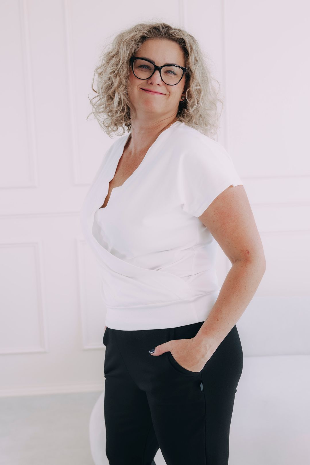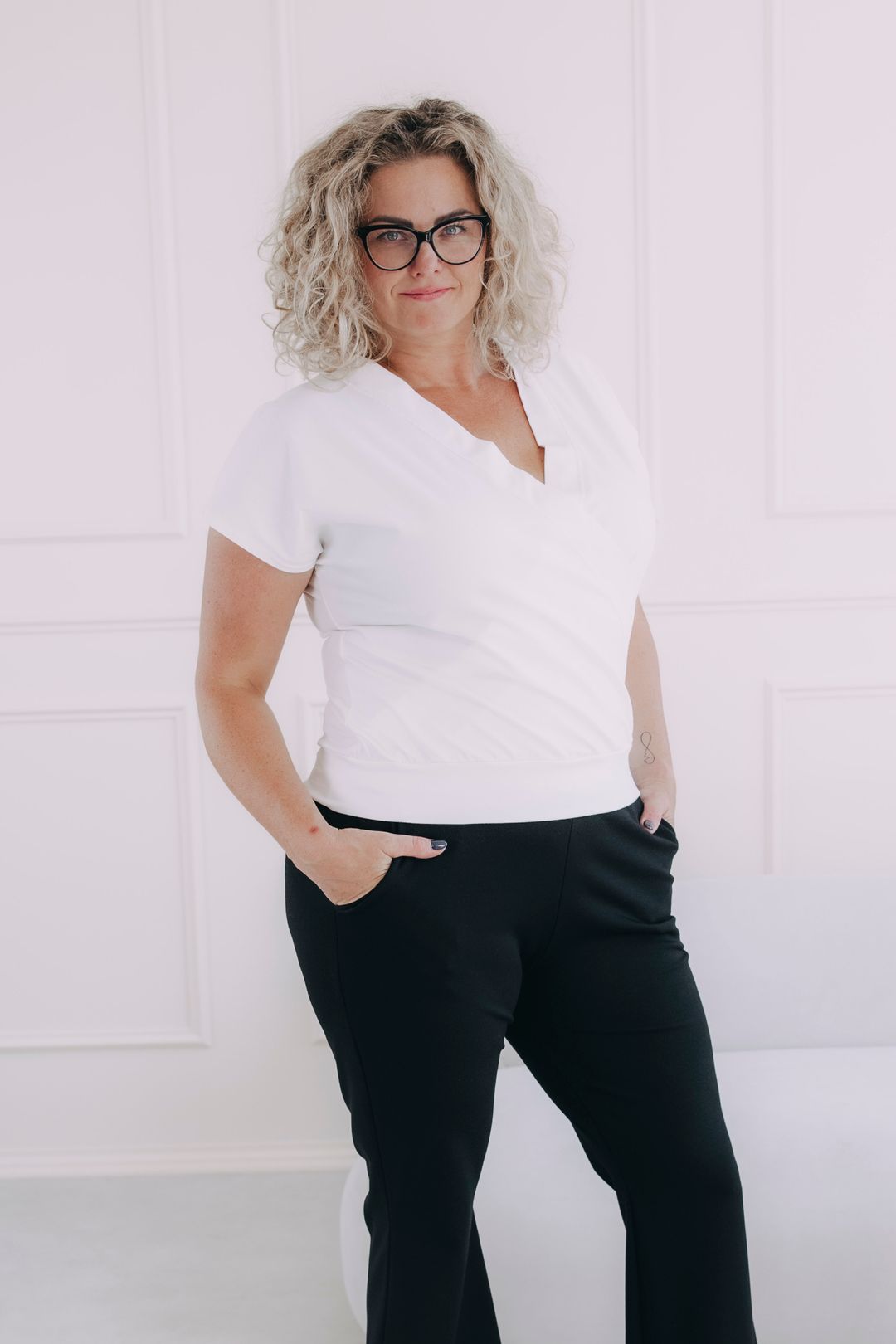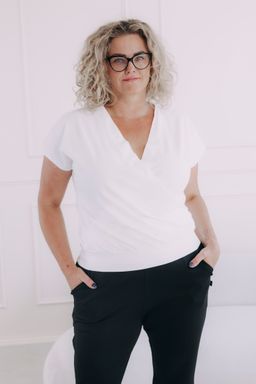 - Vhodnost: Díky svému střihu s překřížením sluší nejvíce ženám s větším poprsím, ale krásně vypadá i na útlejších postavách. Je skvělou volbou, pokud hledáte bílé tričko s krátkým rukávem.