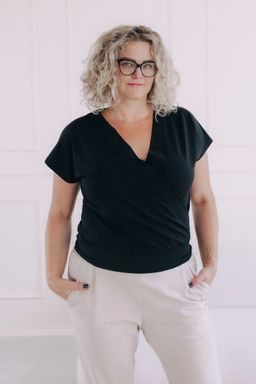 - Střih a detaily: Překřížený výstřih do V působí velmi žensky a opticky prodlouží krk. Krátký rukáv a spodní lem, který jemně obepne tělo, zajistí, že tričko perfektně sedí a nikde se nevyhrnuje.