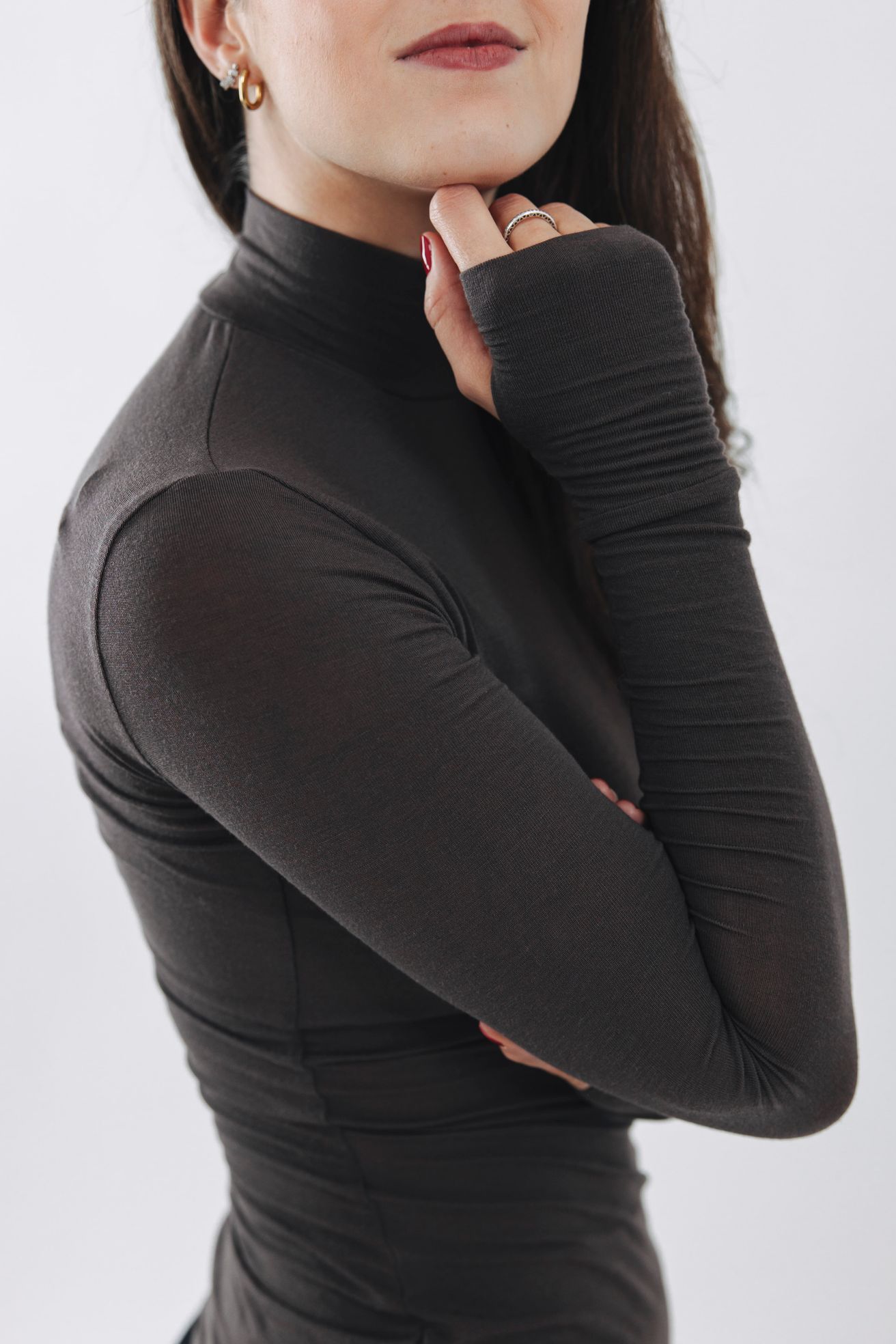 Binta má nižší gramáž, díky které je tak jemný a lehký. Není přímo průsvitný, ale pro váš maximální komfort a 100% jistotu doporučujeme zvolit prádlo v tělové barvě. To pod rolákem úplně zmizí a vy si můžete v klidu užívat ten pocit „druhé kůže“.