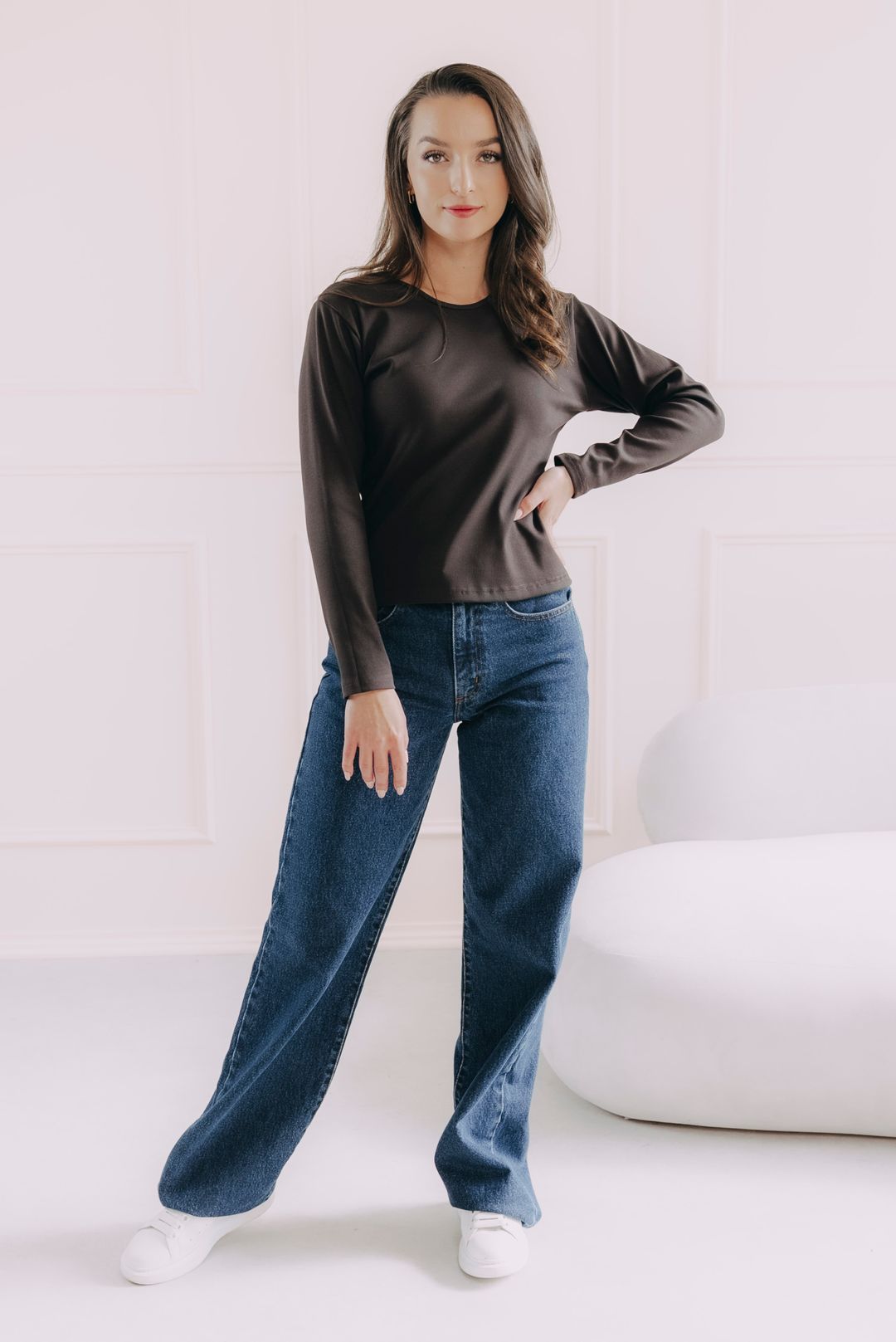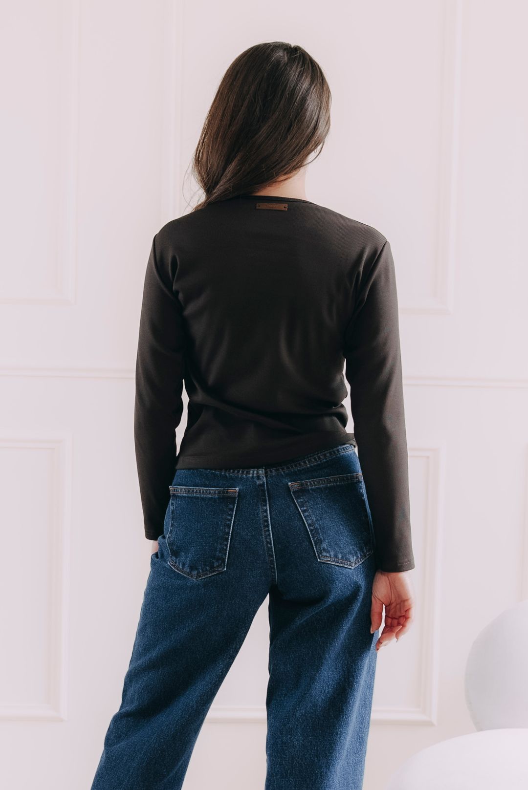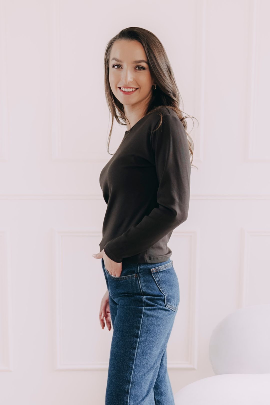 - Střih: Tričko má dlouhý rukáv a kulatý výstřih, který opticky prodlužuje krk.