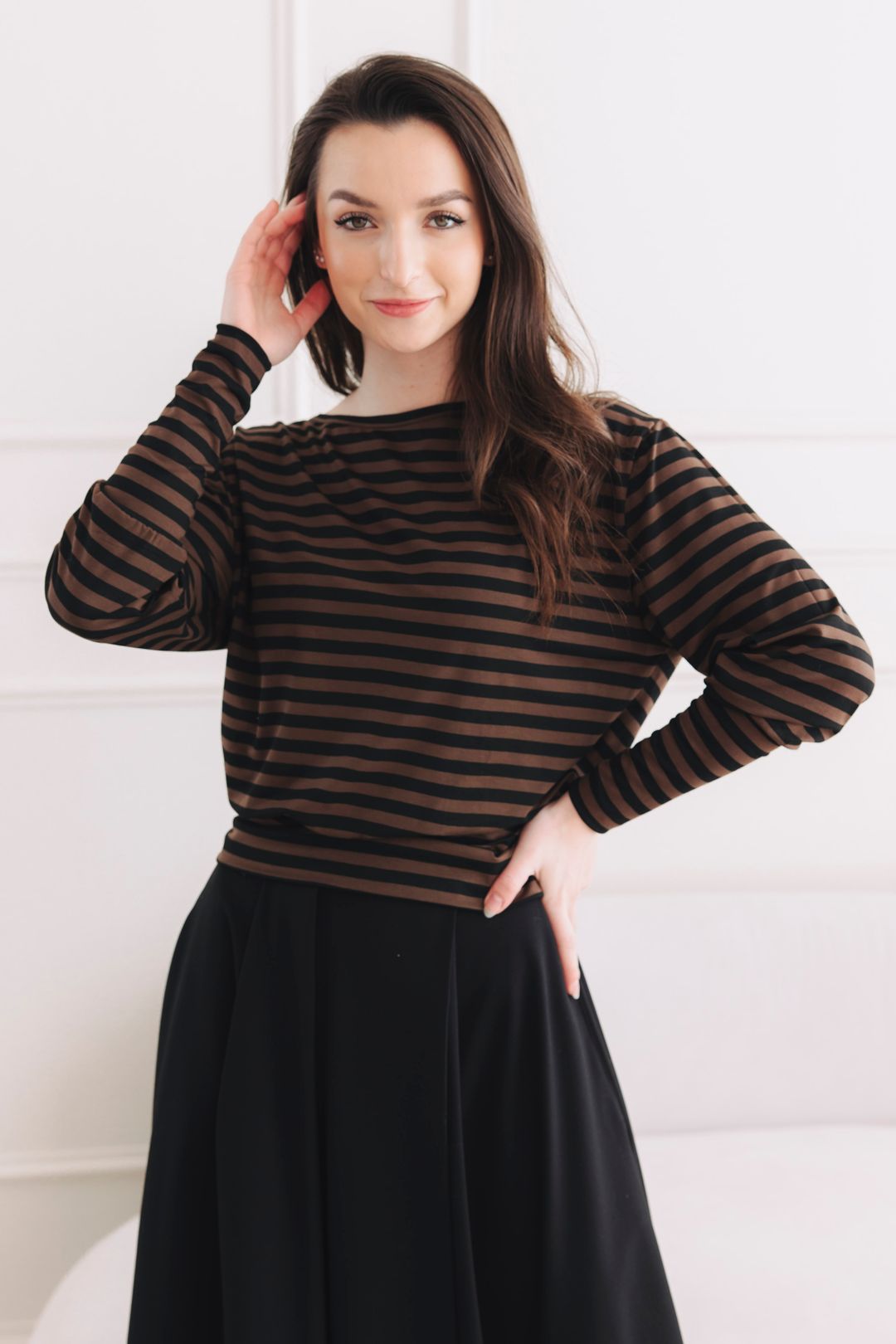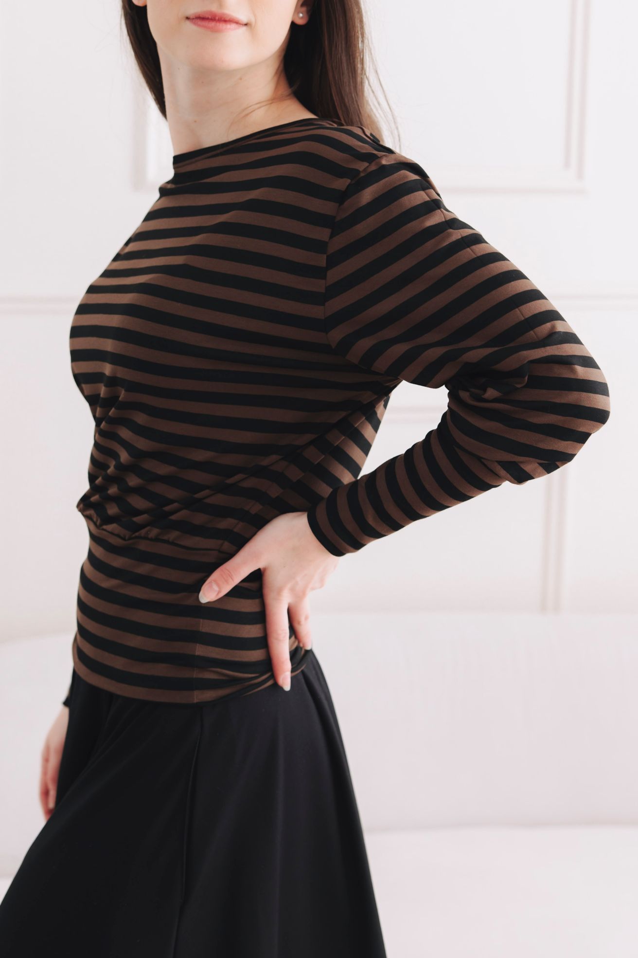 - Střih: Tričko je sice volnější, ale díky zakončení do širšího spodního nápletu se v pase krásně podkasá. Výsledek? Elegantně schované bříško a postava, která vypadá skvěle z každého úhlu. Rukávy jsou zakončeny náplety, které drží přesně tam, kde mají. I když si je lehce vyhrnete k loktům, tričko neztratí svůj tvar a outfit získá na ležérní eleganci.