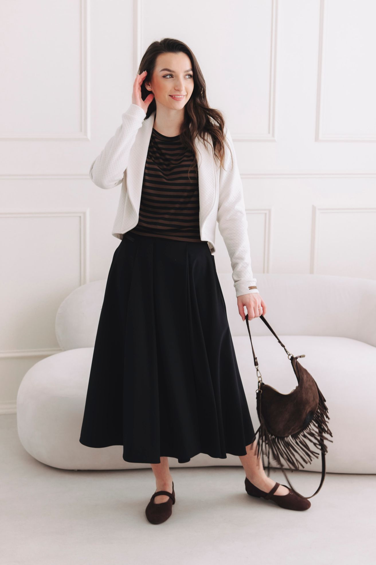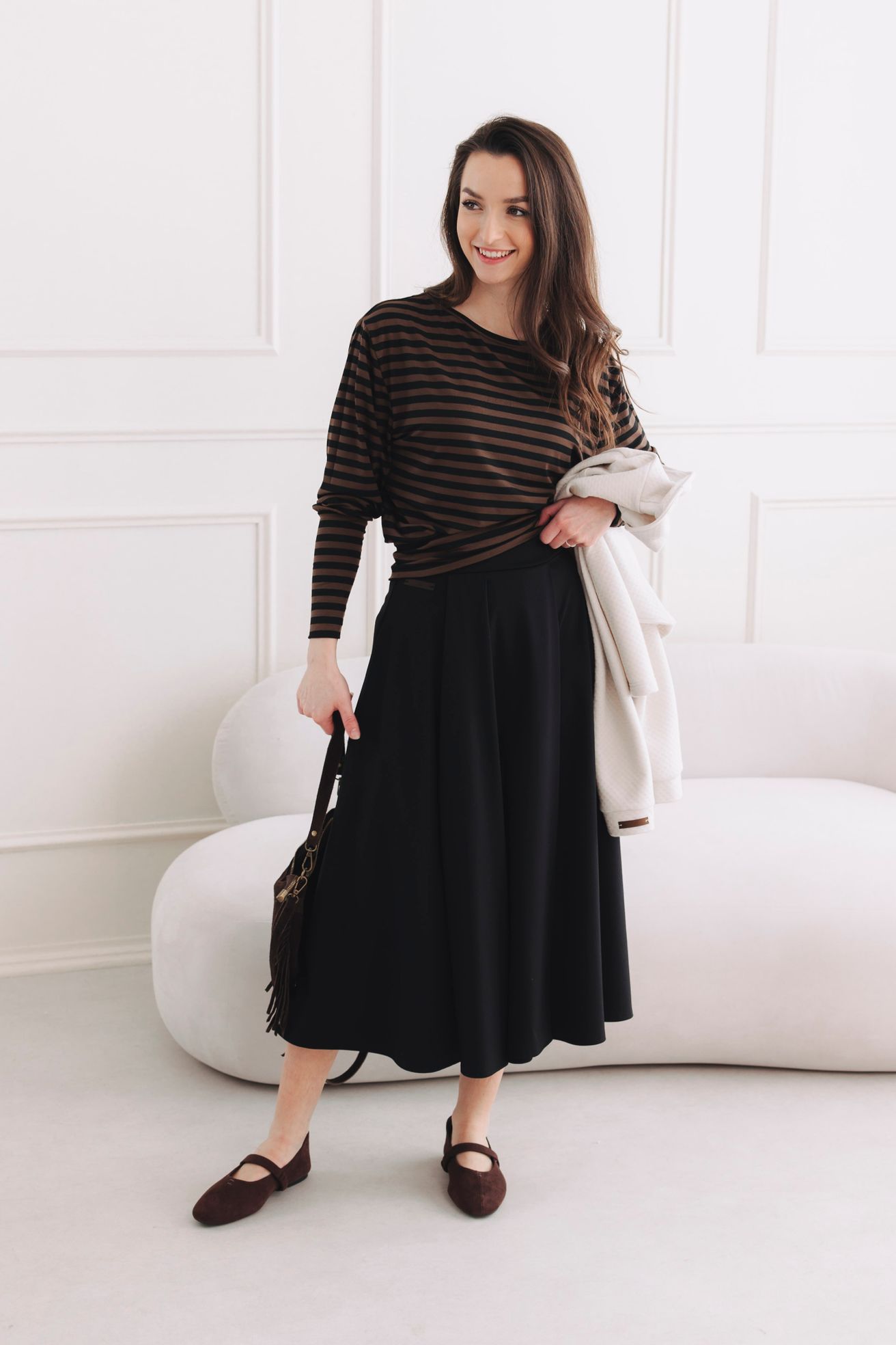 - Elegantně a šik do práce: Chcete v kanceláři působit profesionálně, ale přitom se cítit jako v bavlnce? Zkombinujte Chinedu s naší sukní Mawiv délce nad kolena. Díky spodnímu nápletu tričko nad sukní vytvoří dokonalé podkasání, které lichotí postavě. Stačí přidat jednoduché lodičky nebo mokasíny a outfit, který budí respekt i obdiv, je na světě.