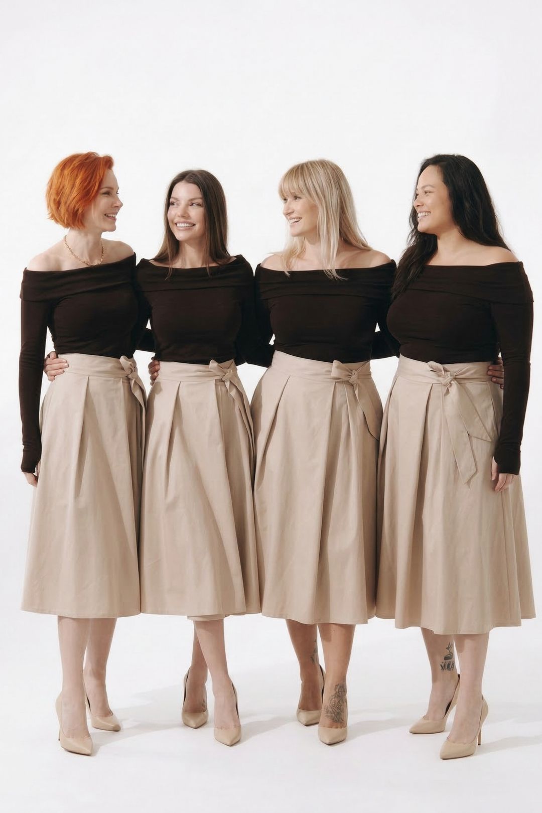 - Ženskost v hlavní roli: Zkombinujte Dalilu s naší sukní Mawi. Tričko zastrčte dovnitř, abyste nechala vyniknout pas a vytvořila dokonalou siluetu. Outfit doplňte jemným řetízkem na krk, který podtrhne odhalená ramena, a obujte klasické lodičky. Tento look je ztělesněním ženskosti, ať už se chystáte na večeři nebo na pracovní schůzku.