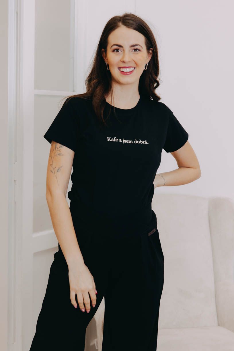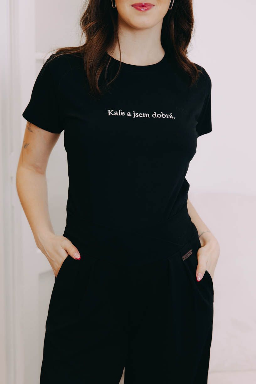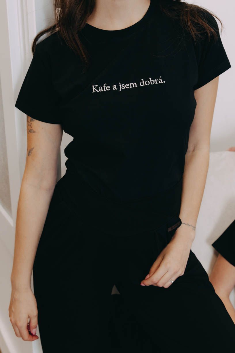 Tričko s originální bugáckou výšivkou krásně doplní váš sportovně ležérní outfit. Jen nezapomenout na to kafe… Protože „Kafe a jsem dobrá“.