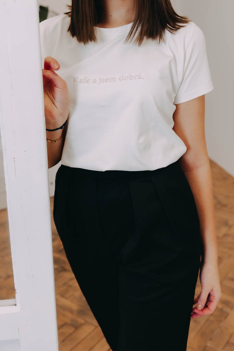 Tričko s originální bugáckou výšivkou krásně doplní váš sportovně ležérní outfit. Jen nezapomenout na to kafe… Protože „Kafe a jsem dobrá“.