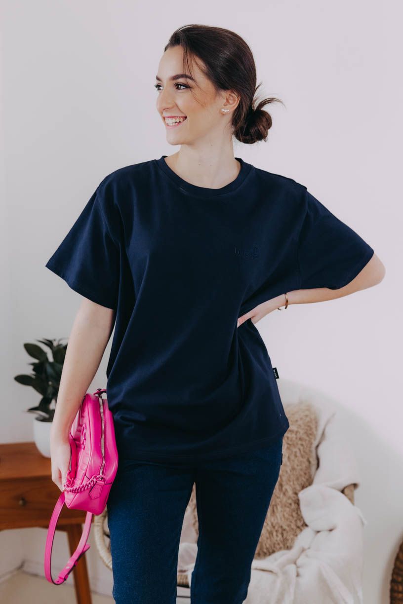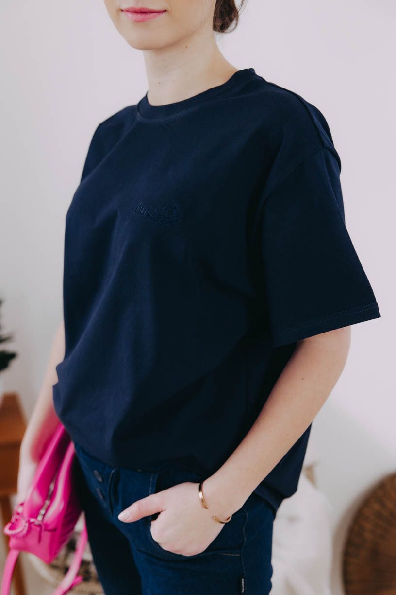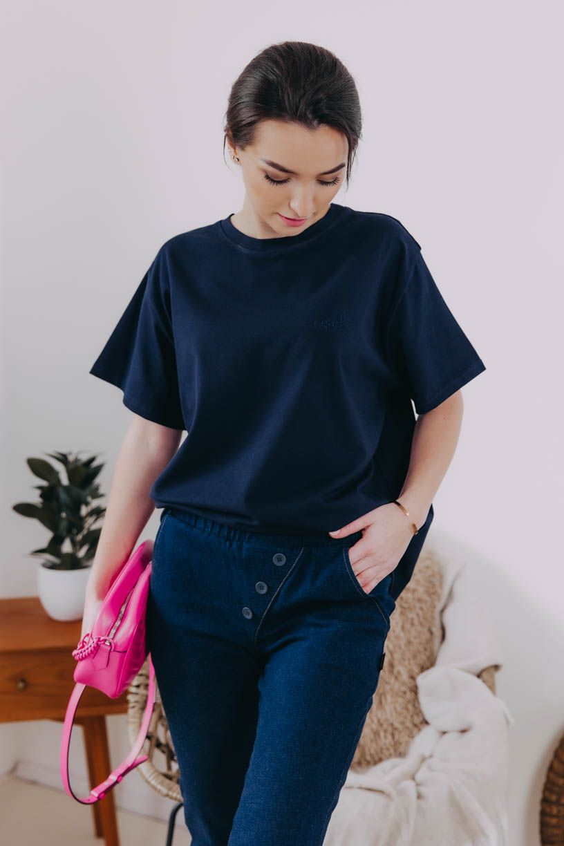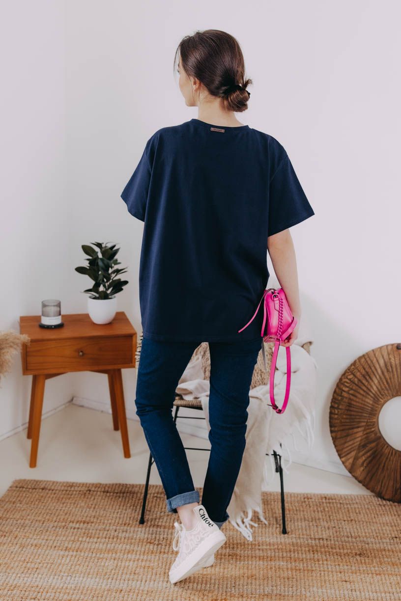 Modré nadčasové oversized tričko Gimbya ušité z prémiové bio bavlny s certifikátem GOTS. Základ kapsulového šatníku, který nikdy nevyjde z módy.