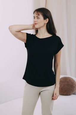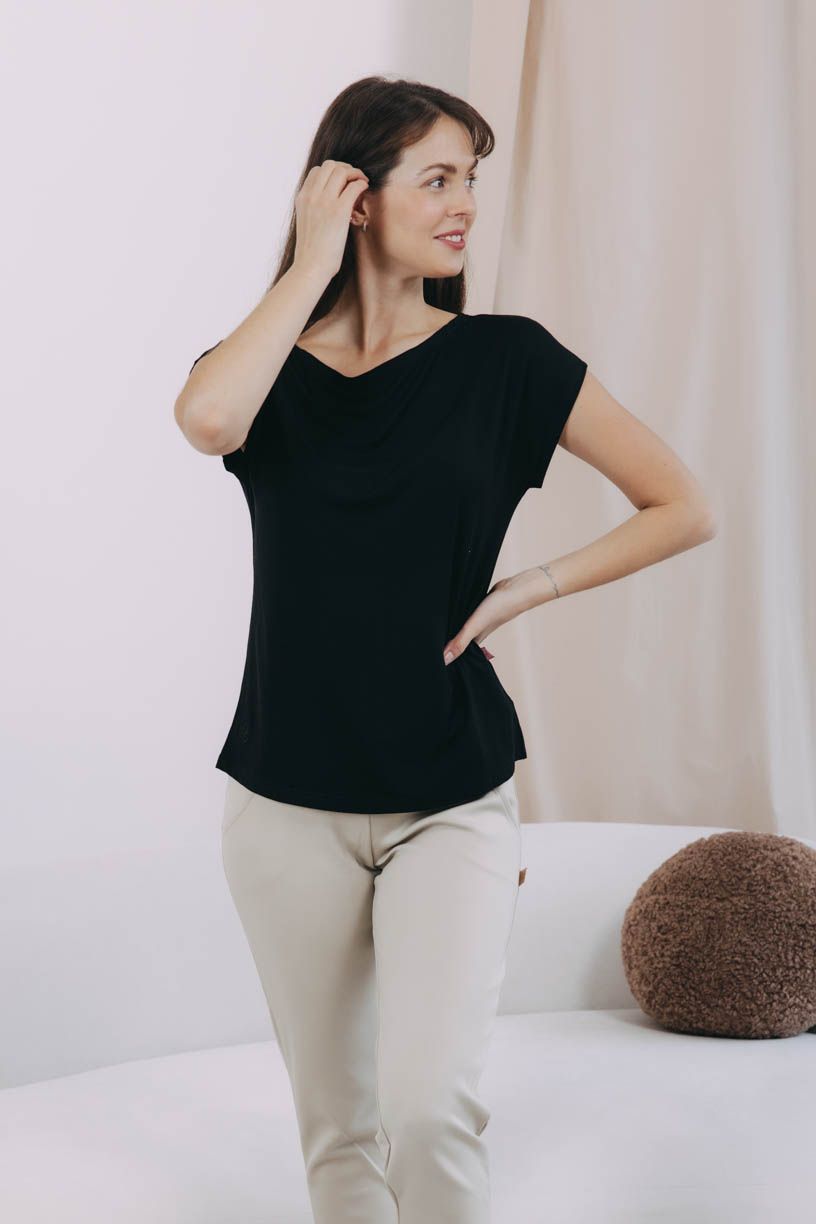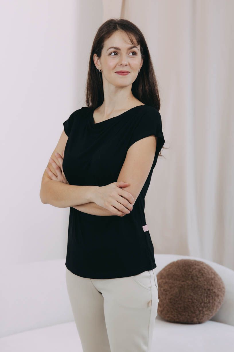 Šatník bez jednobarevných triček je jako léto bez zmrzliny: nepřichází v úvahu. Ty naše jsou z jemného elegantního bambusu - lehoučký a vzdušný materiál jako stvořený na horké letní dny. Sáhli jsme po barevné klasice, černé tričko má širší lodičkový výstřih a rafinovaně střižený spadlý rukáv.