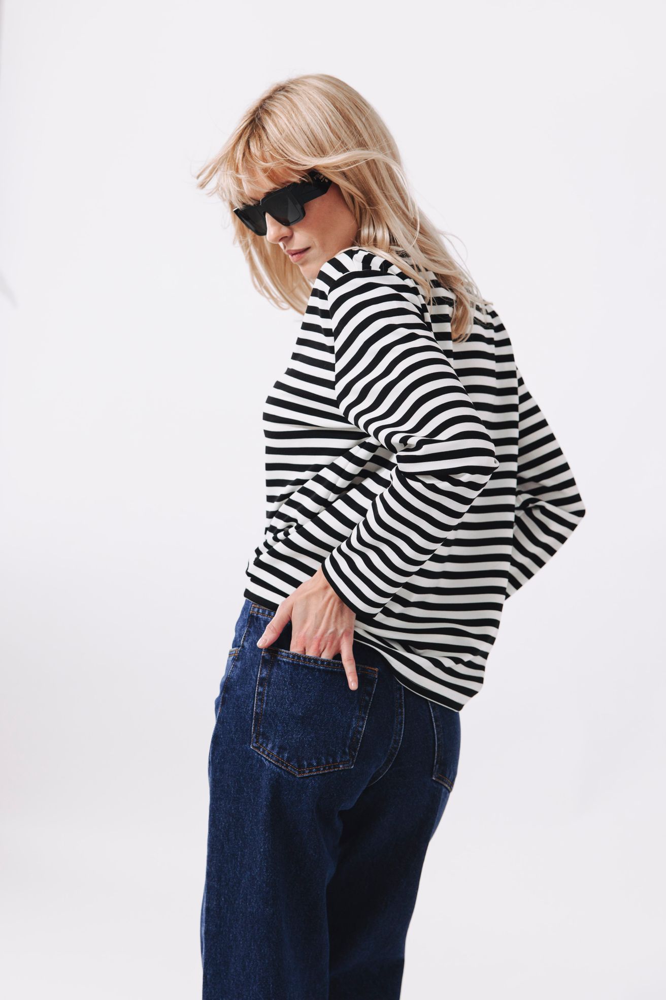 Díky vysoké gramáži materiál látku hezky "podrží" a tričko neobepíná postavu tak kriticky jako tenké úplety. Vodorovný proužek v tomto pevném provedení naopak působí velmi harmonicky a stylově na všech typech postav.
