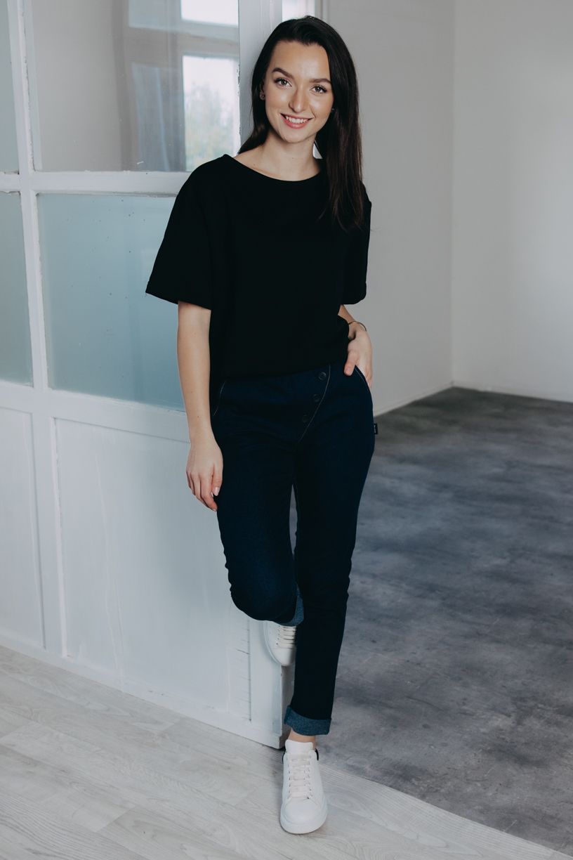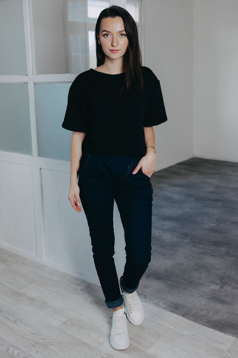 Není nic otravnějšího, než když se vám tričko vyhrnuje a nedrží ani zastrčené. Naše Peťa ale pro jakýkoli problém s oblečením najde řešení. Efektní tričko Kayla vychází ze střihu trička Jini, které jsme v polovině odstřihli. Vznikl příjemně volný bavlněný top s širokými rukávy, který krásně doplní výraznější kousky.