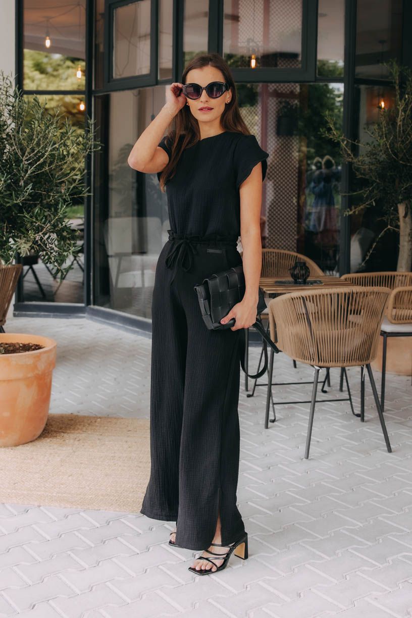 Černé mušelínové tričko Kemi s nápaditě řešenými rukávy a praktickou gumičkou v pase na podkasání je skvělým parťákem pro letní dny a nekonečné kombinování.