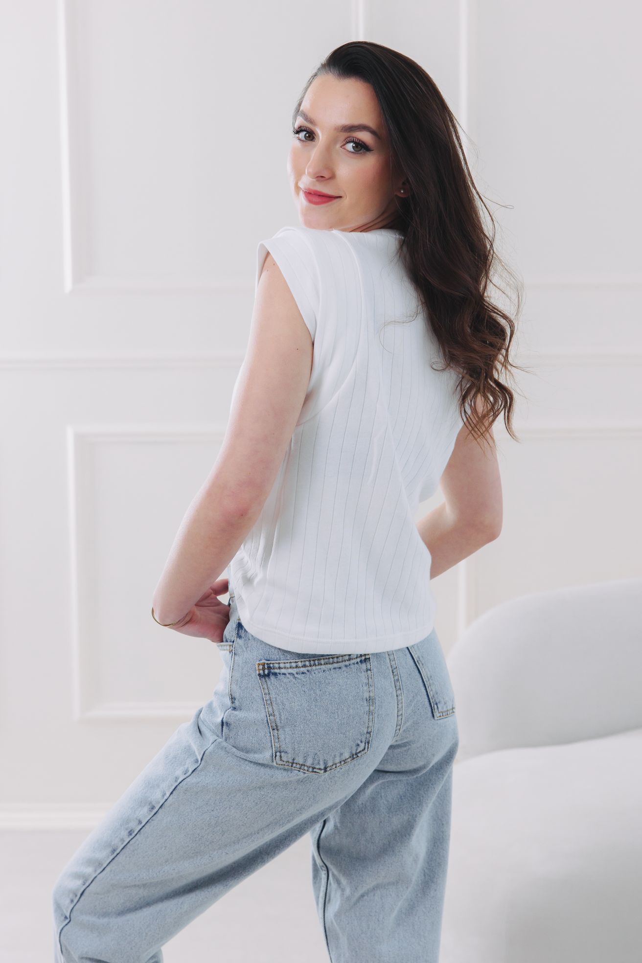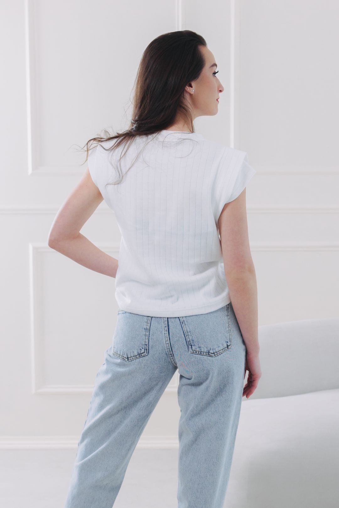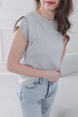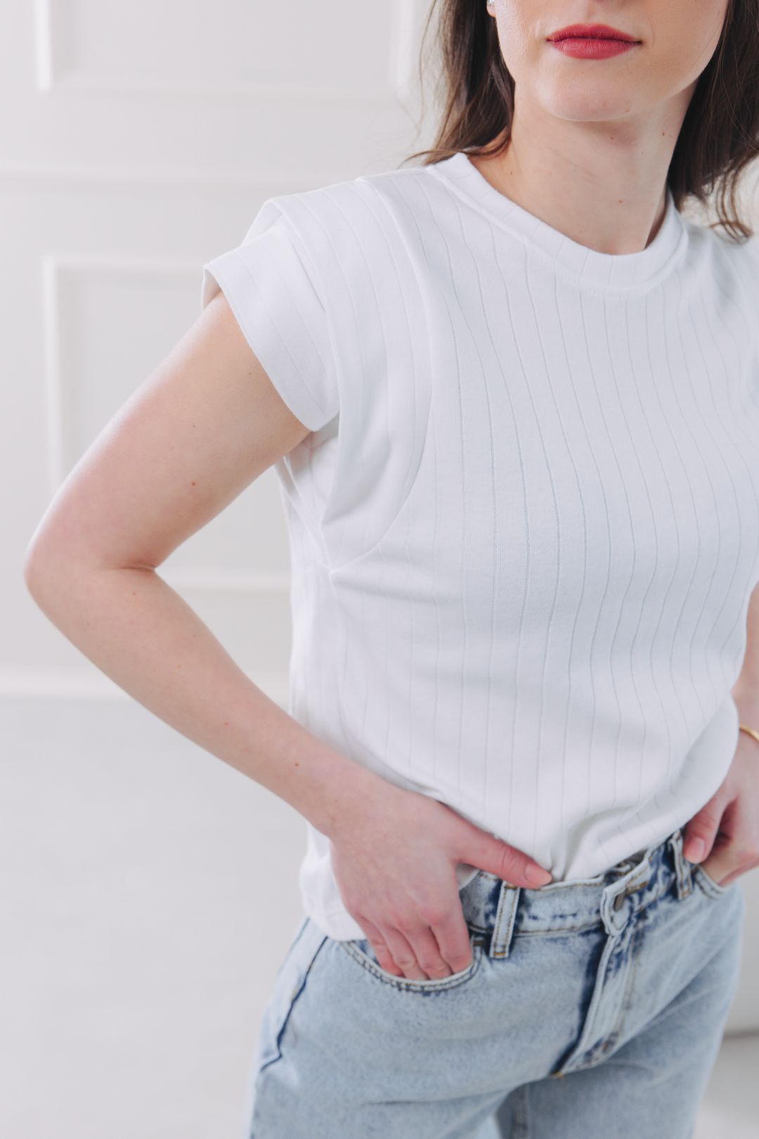 • Střih: Základem je čistý střih s klasickým kulatým výstřihem, který vytváří krásnou symetrii a jemně lemuje klíční kosti. Tento minimalistický základ jsme povznesli hravým detailem. Vrstvené rukávy s efektem jemných volánků vytvářejí něžnou linii ramen a opticky balancují siluetu. Jsou tak ideální volbou pro ženy s užšími rameny, kterým dodají na ženskosti a sebevědomí.