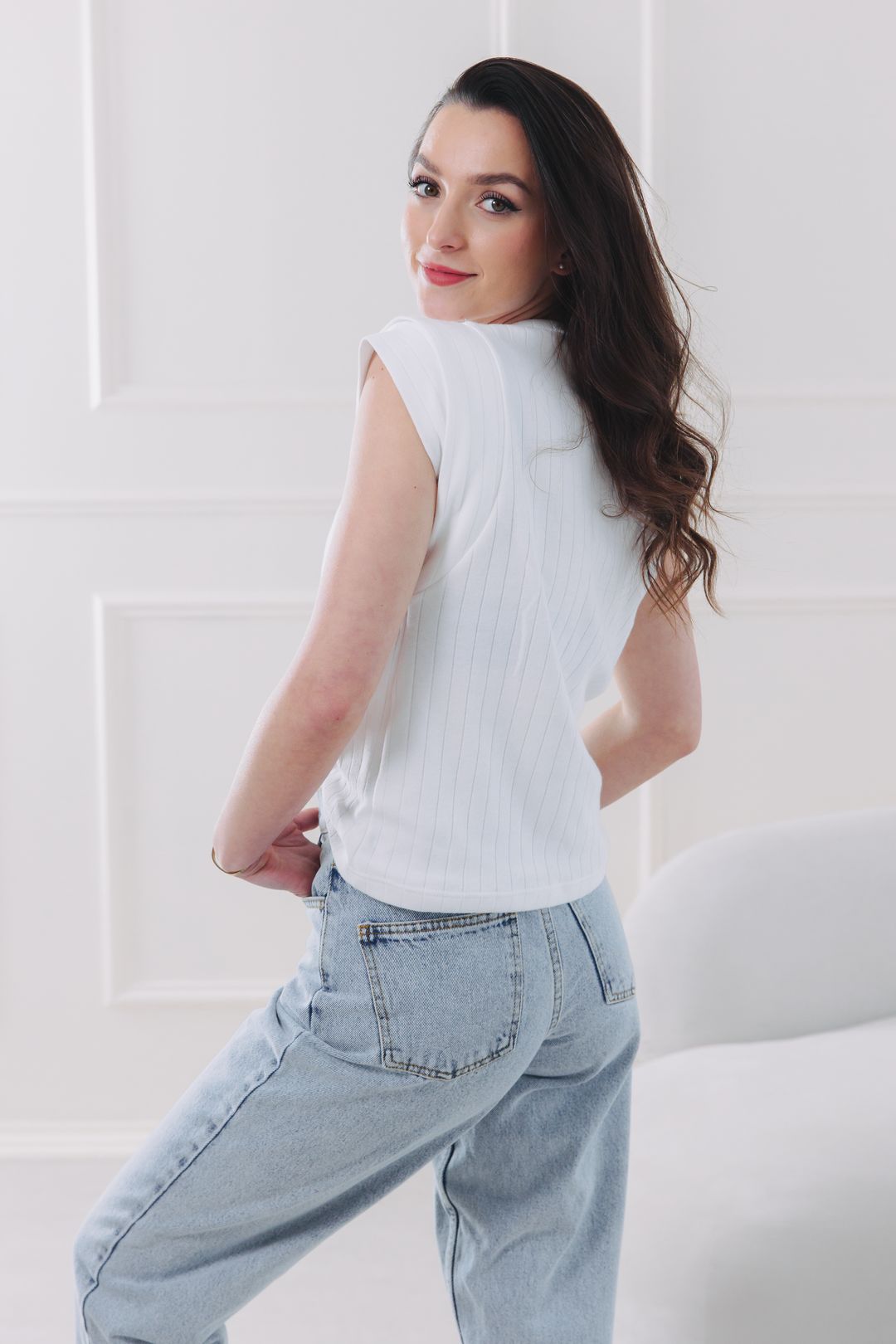 Určitě ano. Jeho střih je navržen tak, aby slušel všem, ale skutečným „game changerem“ je pro ty z nás, které mají užší ramena nebo postavu typu hruška. Navrstvené rukávy totiž jemně dodají objem v horní části těla, čímž krásně vybalancují širší boky a vytvoří harmonickou siluetu. Pokud máte širší ramena, nemusíte se bát – volánky jsou splývavé a nepůsobí jako vycpávky, jen dodají outfitu zajímavý detail.