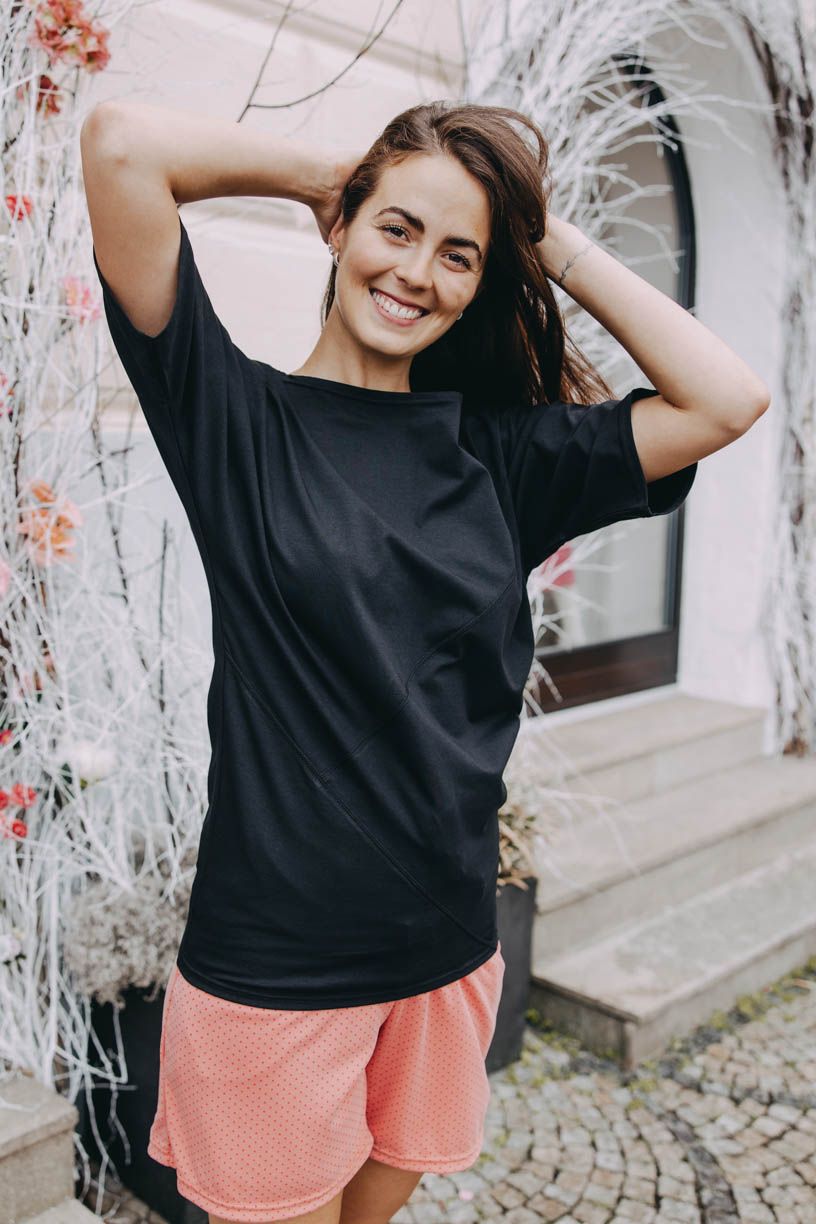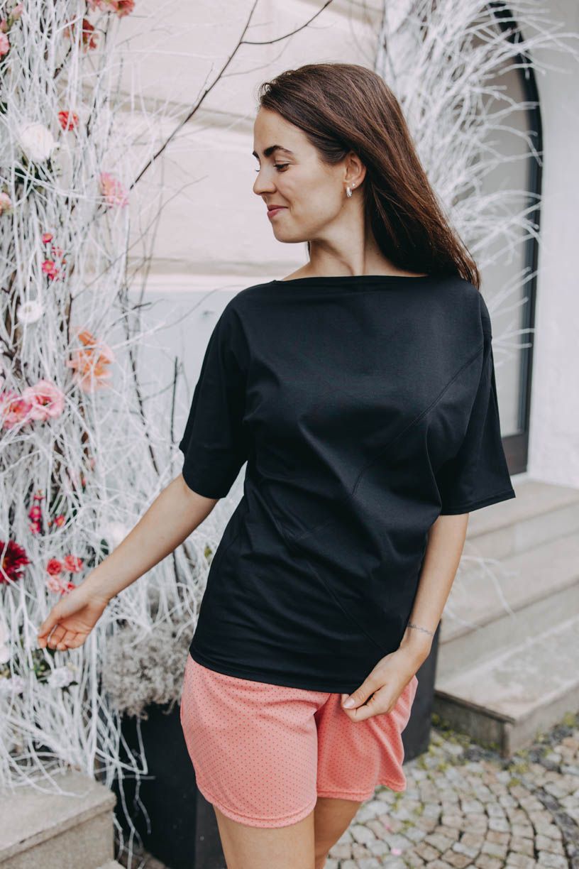 Elastické oversized tričko s nápaditými, ale decentními šikmými švy v barvě látky, netopýřími rukávy a elegantním lodičkovým výstřihem si zamilujete.