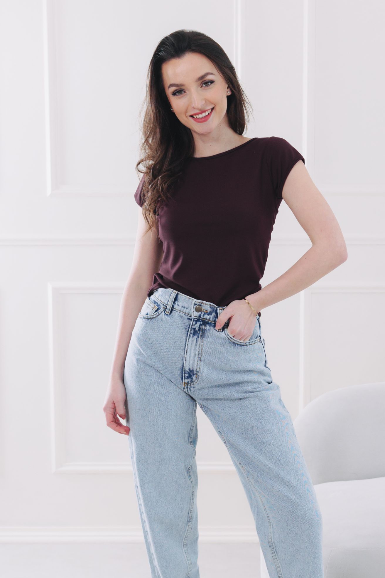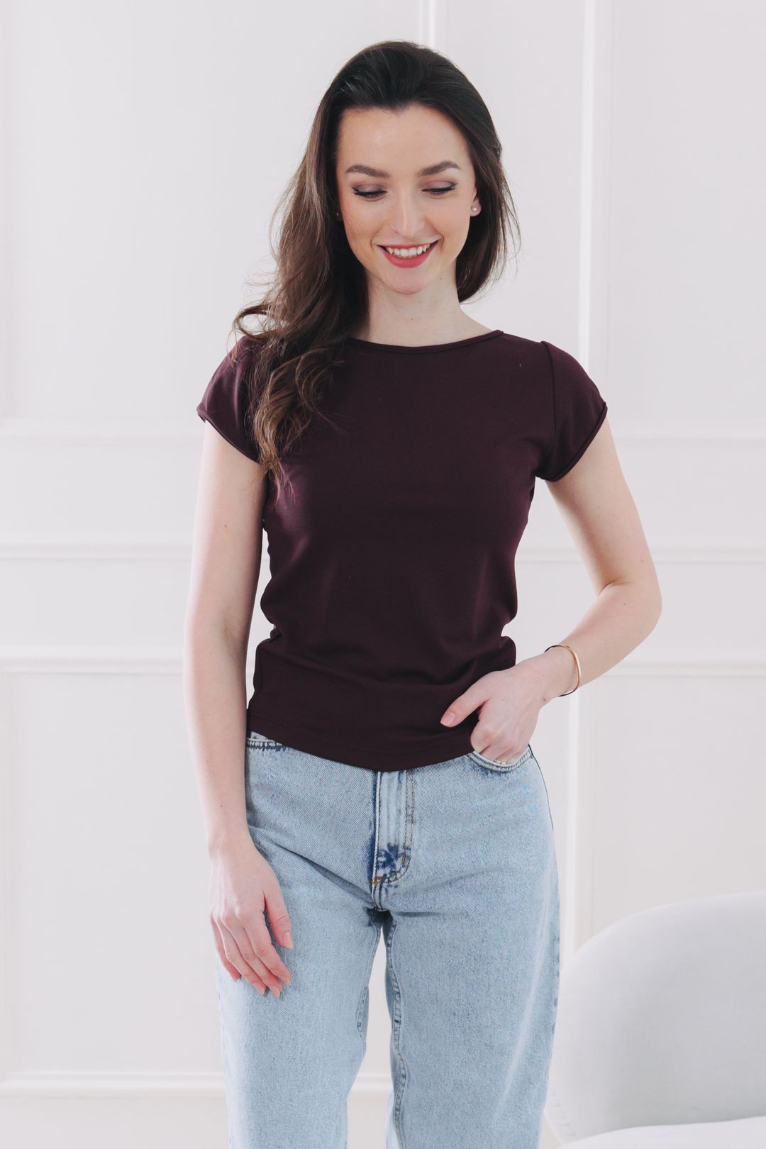 - Střih: Tričko Ola sází na lichotivou siluetu, která jemně kopíruje postavu, ale nechává vám dostatek prostoru pro pohyb. Klasický krátký rukáv a ideální délka z něj dělají ten nejuniverzálnější kousek k džínám i sukni.