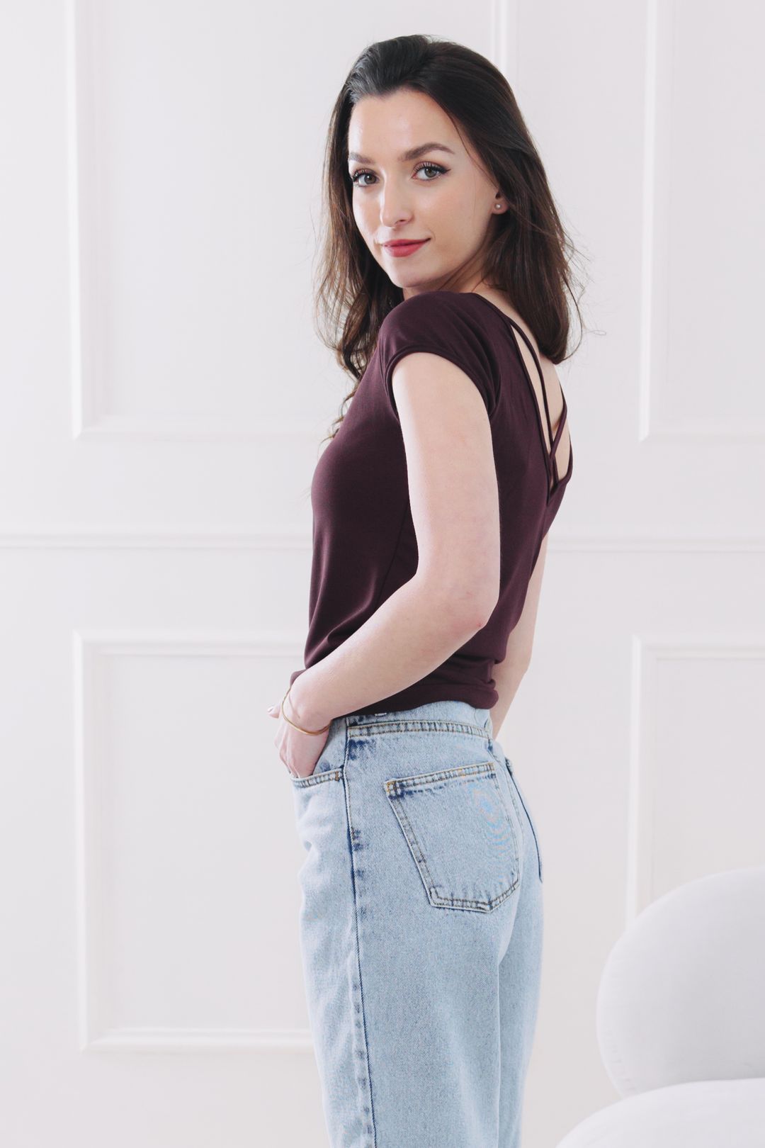 - Detail na zádech: Elegantní výstřih a křížení na zádech dodává tričku Ola punc originality a elegance.