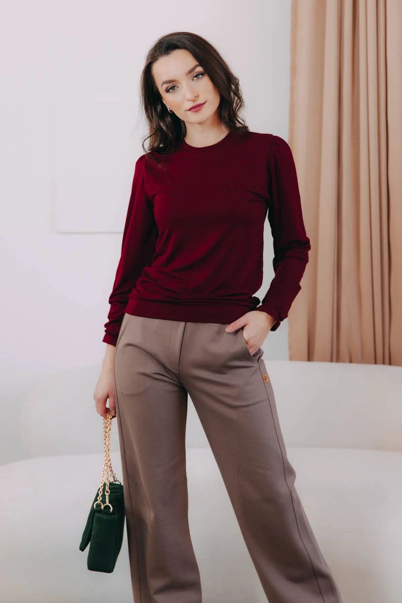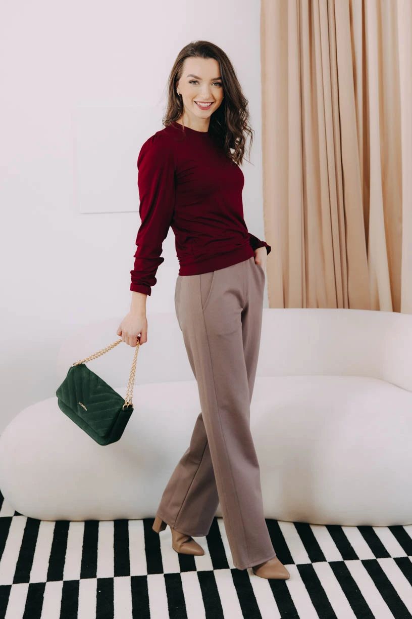 Bordó je jednou z nejelegantnějších barev vůbec a vašemu outfitu dodá nebývalou ženskost. Mírně nabírané rukávy dodávají tričku šmrnc, který ještě umocňuje detail v podobě nařaseného lemu na koncích.