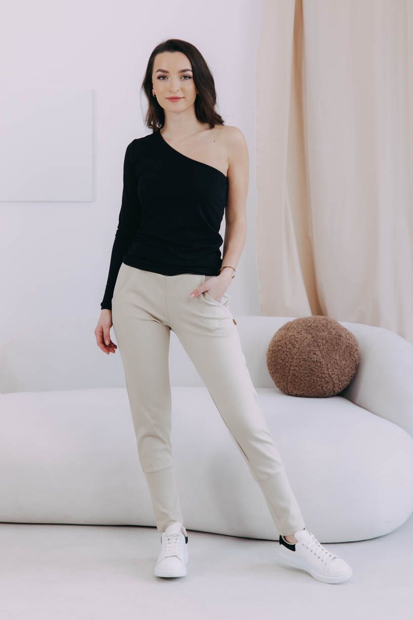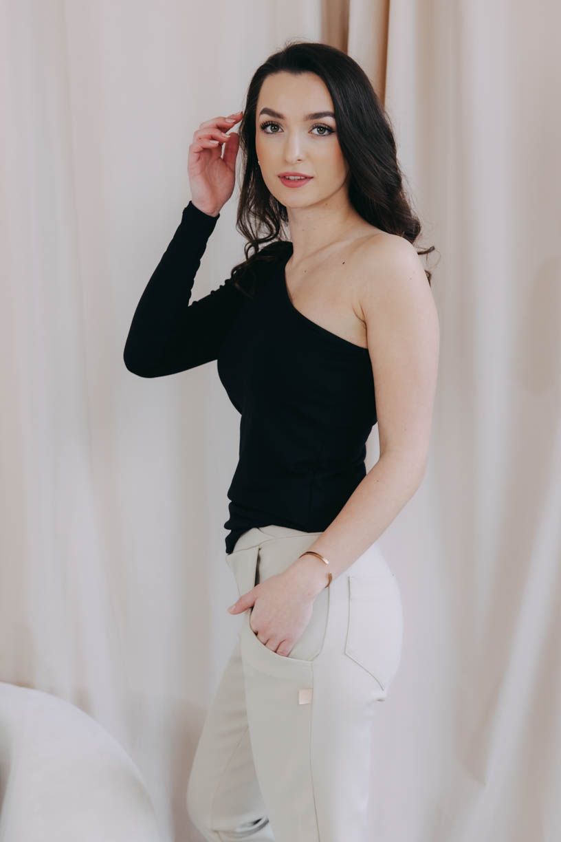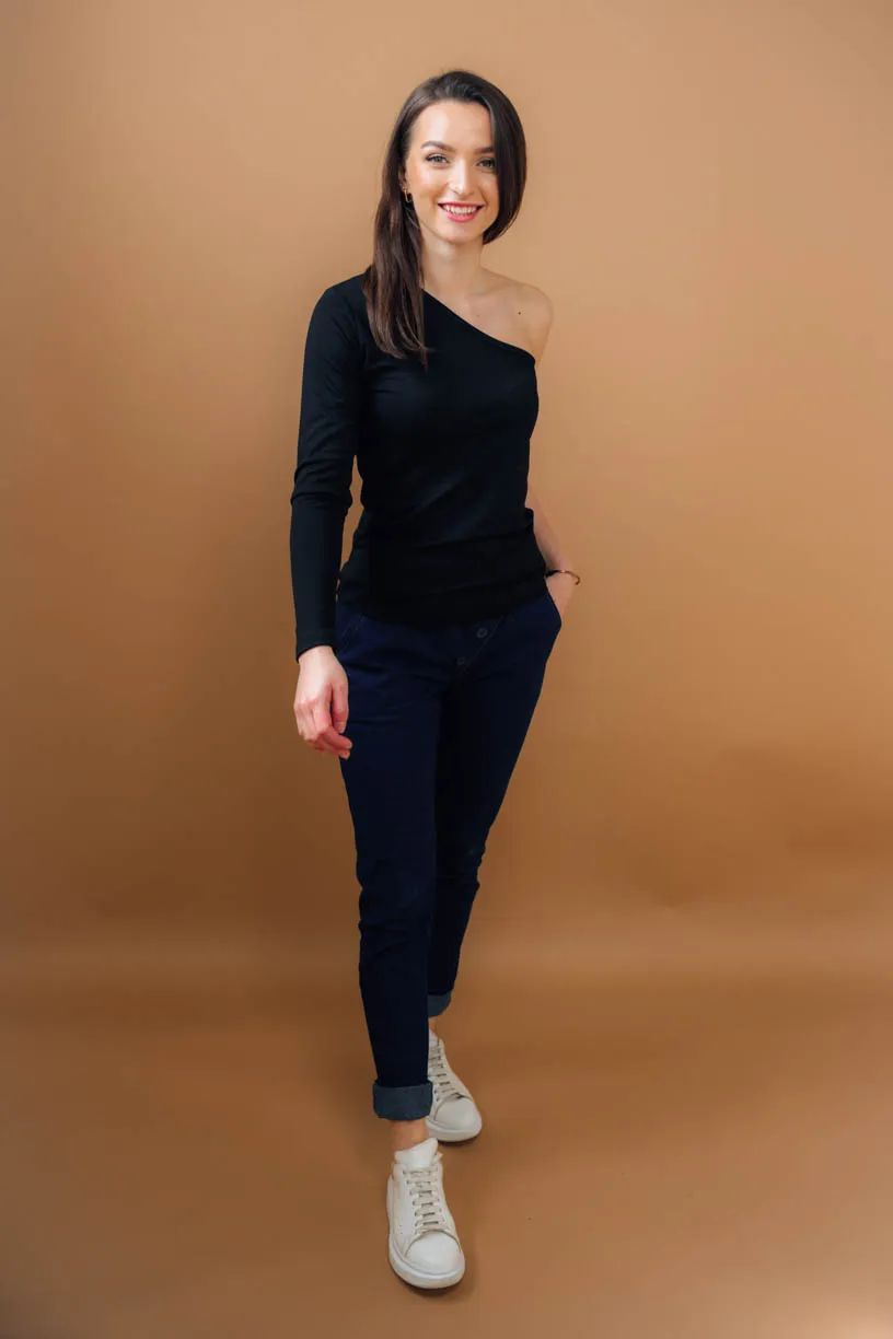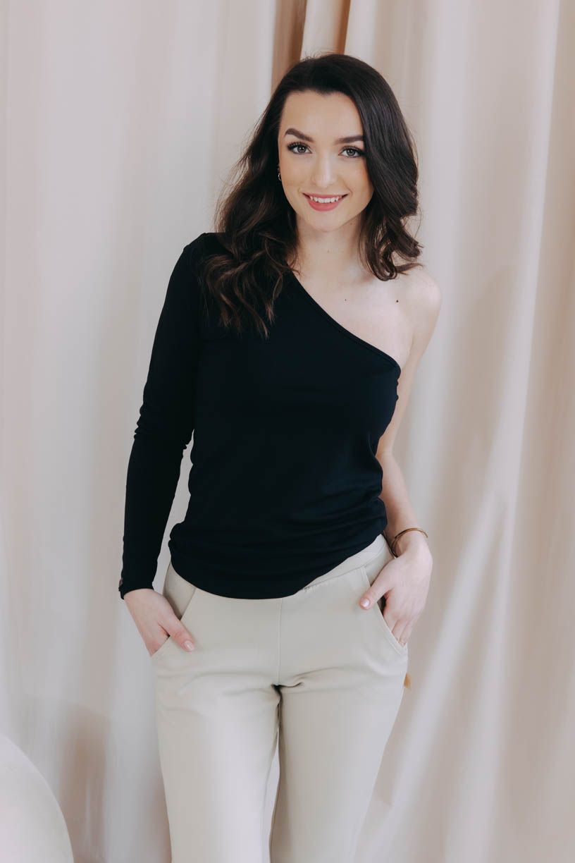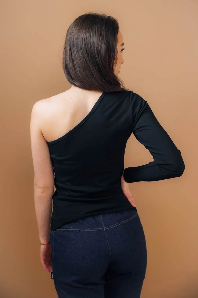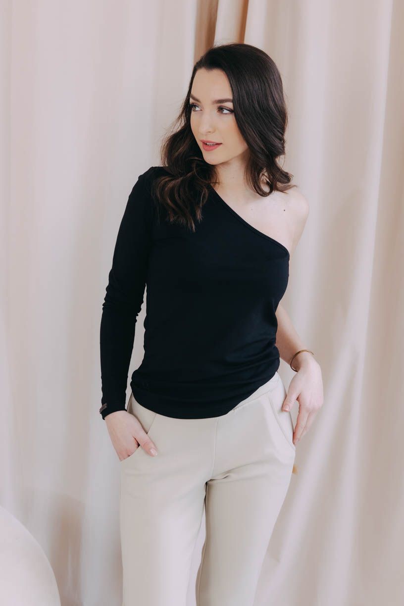 Černé obepnuté asymetrické tričko Thimba s dlouhým rukávem a odhaleným ramenem – ideální na slavnostnější příležitosti nebo na párty.