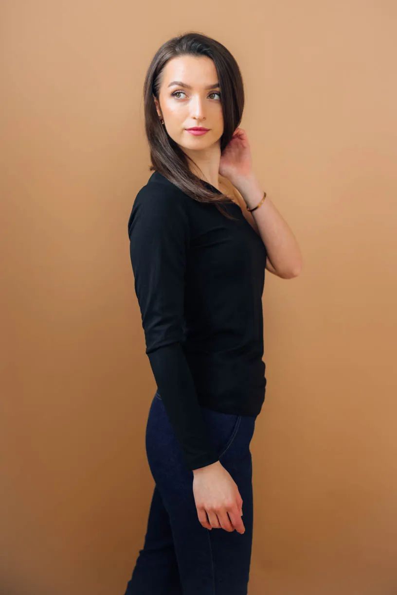 Černých triček není nikdy dost. Thimba mezi nimi ale bude dokonale vynikat díky svému asymetrickému střihu. Jeden rukáv jsme ušili dlouhý až po zápěstí, zatímco druhou stranu topu jsme nechali naprosto „bez“. Odhalené rameno tak jasně ukáže, že vy se na svět rozhodně nedíváte jednostranně.