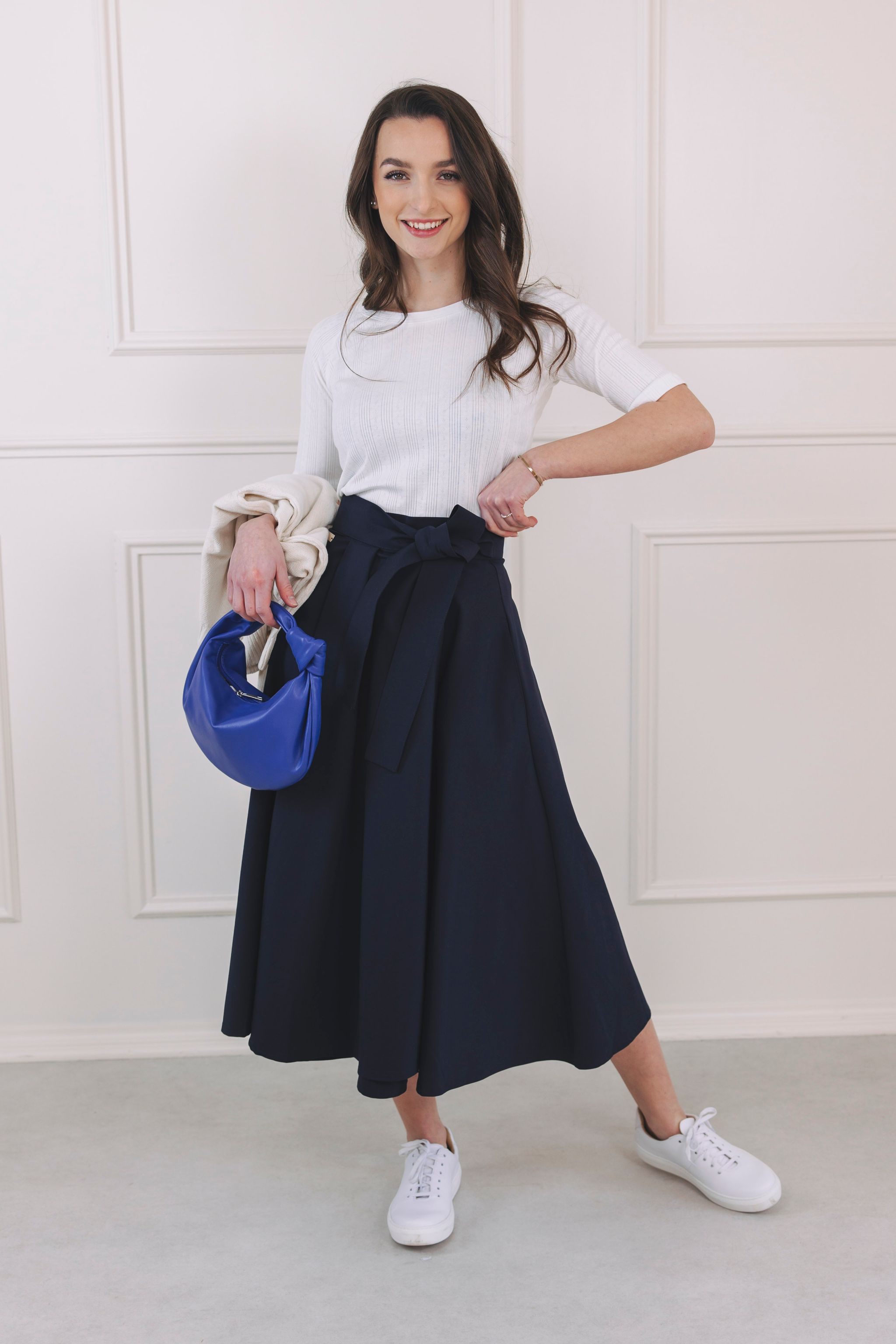 - Moderní Business look: Oblečte Yasminu k černým cigaretovým kalhotám a navrch přehoďte delší oversize sako. Celý outfit doplňte lodičkami a kvalitní kabelkou.