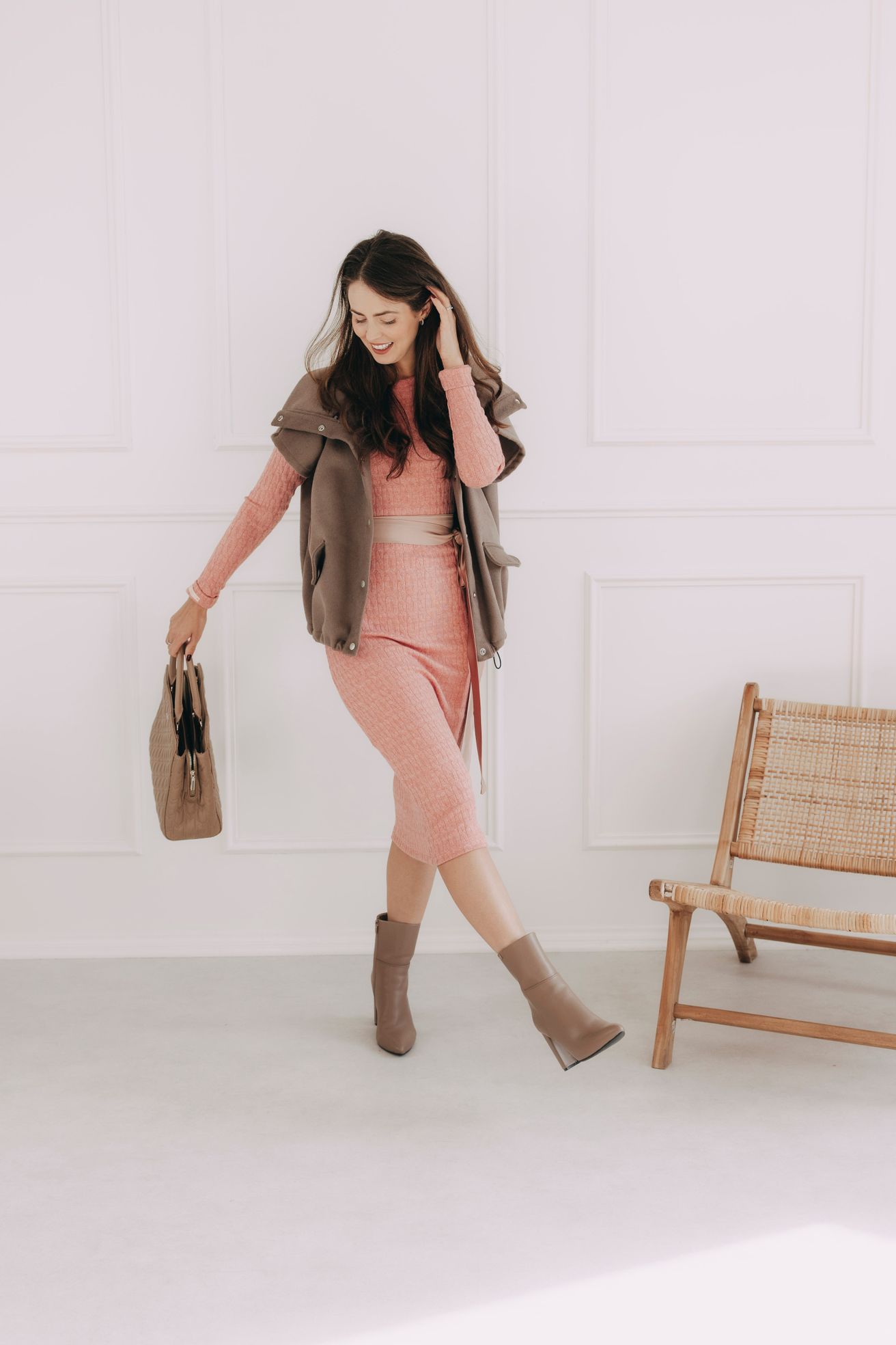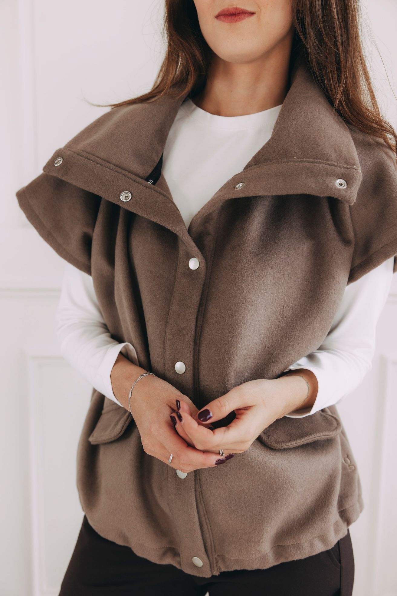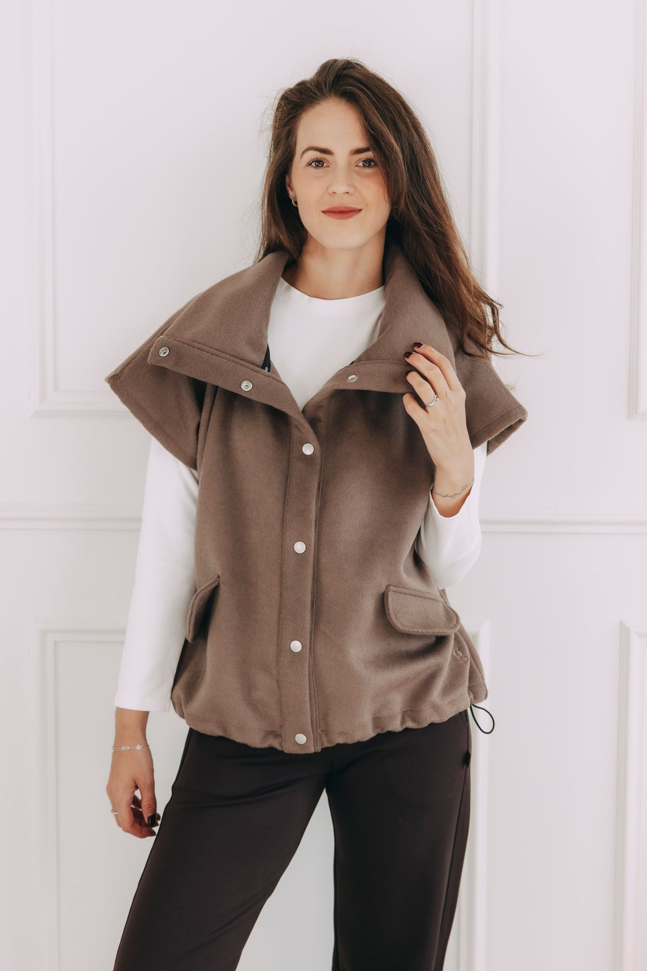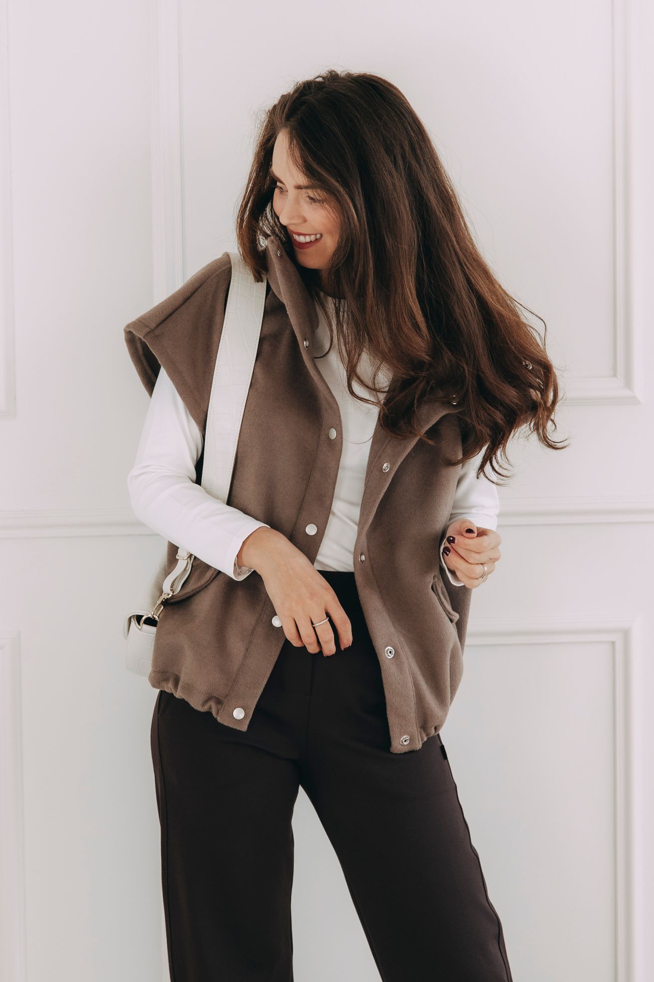 - Městská elegance: Noste vestu zapnutou přes rolák nebo bílou košili. Oblečte ji s úzkými kalhotami v tmavé barvě a doplňte robustními kotníkovými botami – ideální vesta do města i na pracovní setkání.